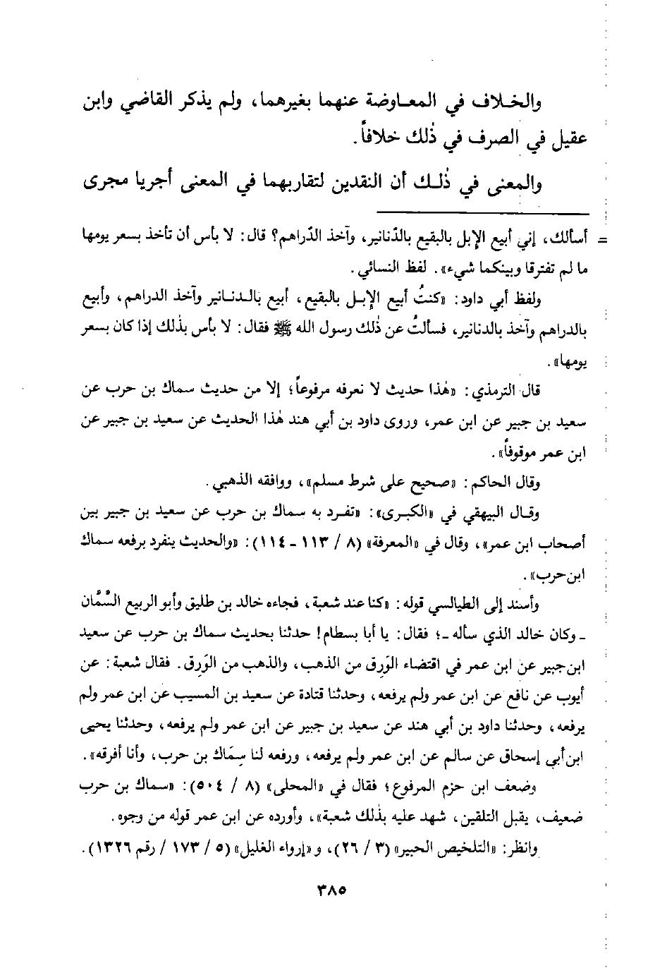 ولفظ أبي داود: "كنتُ أبيع الإِبل بالبقيع، أبيع بالدنانير وآخذ الدراهم، وأبيع بالدراهم وآخذ بالدنانير، فسألتُ عن ذلك رسول اللَّه -صلى اللَّه عليه وسلم- فقال: لا بأس بذلك إذا كان بسعر يومها".