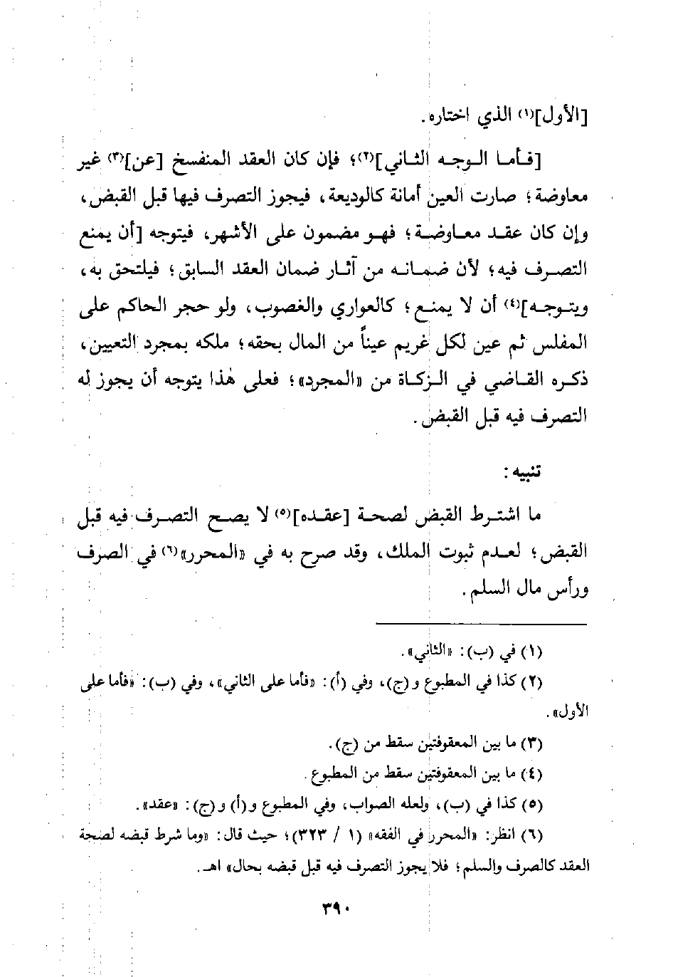 (¬6) انظر: "المحرر في الفقه" (1/ 323)؛ حيث قال: "وما شرط قبضه لصحة العقد كالصرف والسلم؛ فلا يجوز التصرف فيه قبل قبضه بحال" اهـ.