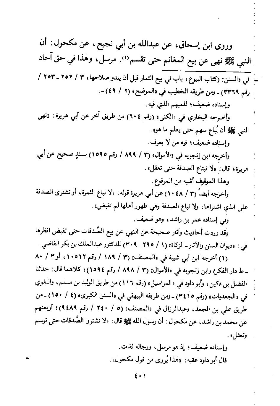 (¬1) أخرجه ابن أبي شيبة في "المصنف" (3/ 189/ رقم 10512، أو 3/ 80 - ط دار الفكر) وابن زنجويه في "الأموال" (3/ 898/ رقم 1594)؛ كلاهما قال: حدثنا الفضل بن دكين، وأبو داود في "المراسيل" (رقم 116) من طريق الولد بن مسلم، والبغوي في "الجعديات" (رقم 3415) -ومن طريقه البيهقي في "السنن الكبرى" (4/ 150) - من طربق علي بن الجعد، وعبد الرزاق في "المصنف" (5/ 240/ رقم 9489)؛ أربعتهم عن محمد بن راشد، عن مكحول: أن رسول اللَّه -صلى اللَّه عليه وسلم- قال: "لا تشتروا الصَّدقات حتى توسم وتعقل".