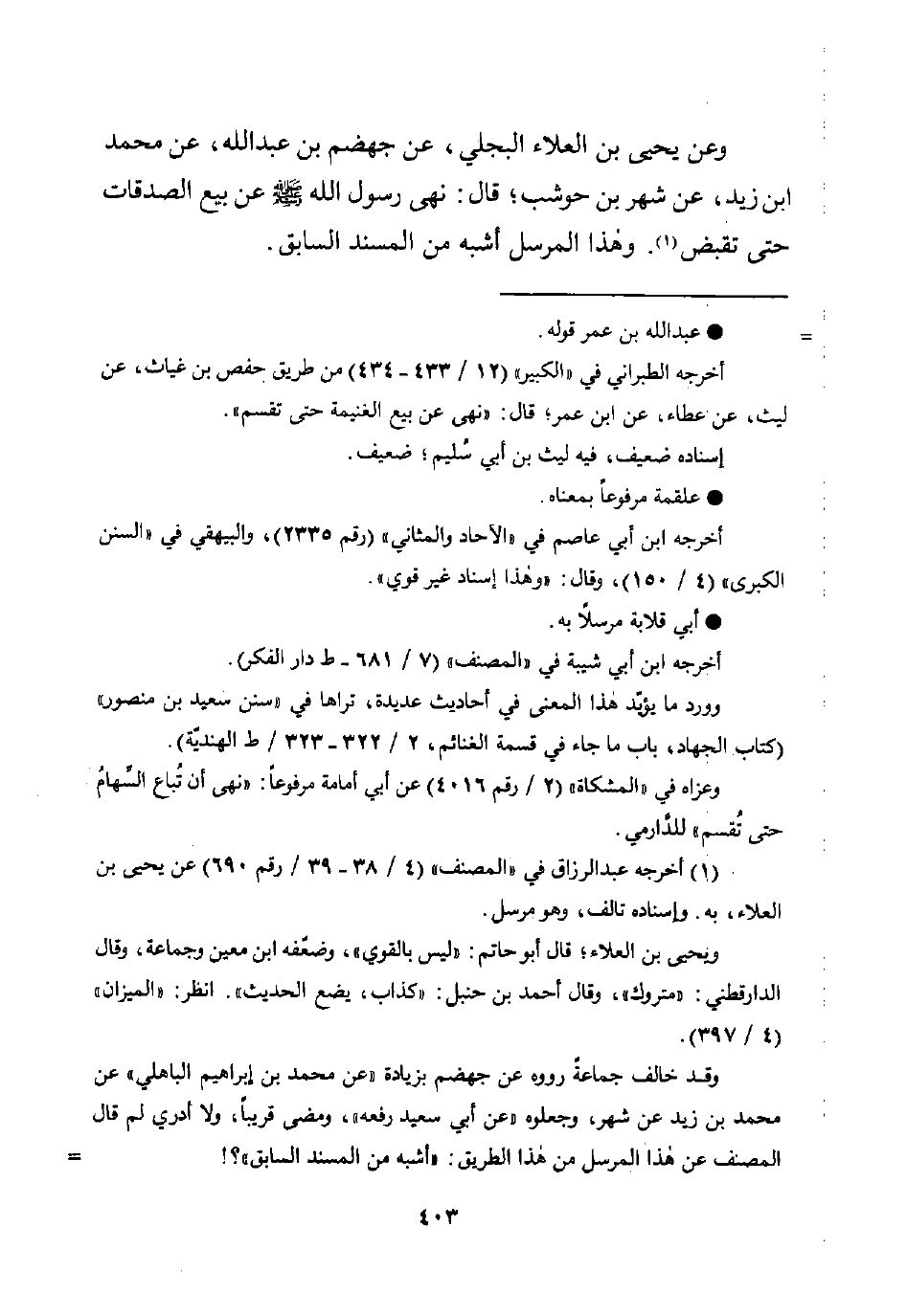 وعن يحيى بن العلاء البجلي، عن جهضم بن عبد اللَّه، عن محمد ابن زيد، عن شهر بن حوشب؛ قال: نهى رسول اللَّه -صلى اللَّه عليه وسلم- عن بيع الصدقات حتى تقبض (¬1). وهذا المرسل أشبه من المسند السابق.
