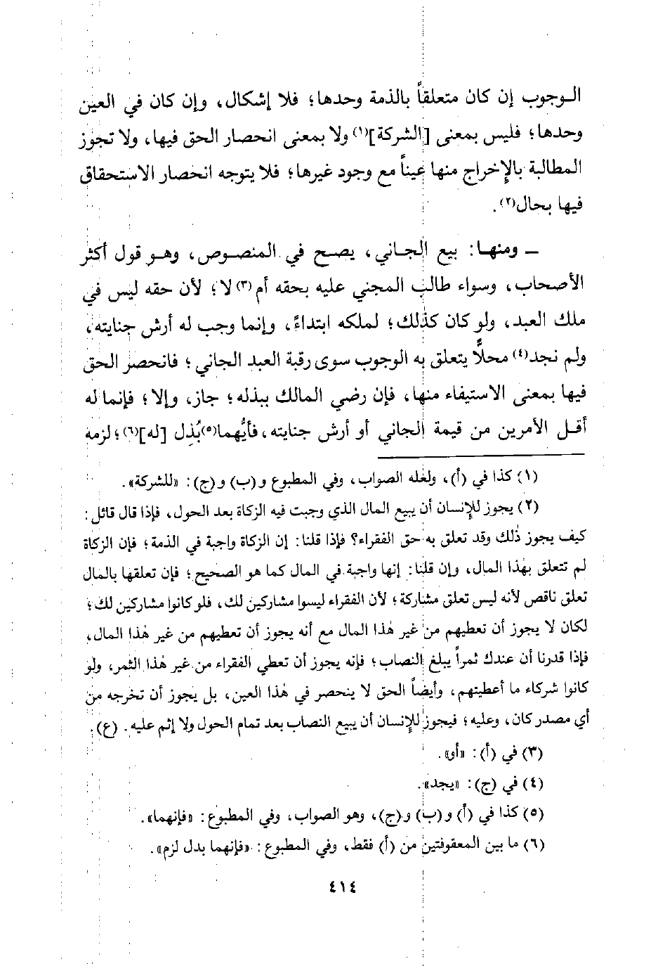 الوجوب إن كان متعلقًا بالذمة وحدها؛ فلا إشكال، وإن كان في العين وحدها؛ فليس بمعنى [الشركة] (¬1) ولا بمعنى انحصار الحق فيها، ولا تجوز المطالبة بالإِخراج منها عينًا مع وجود غيرها؛ فلا يتوجه انحصار الاستحقاق فيها بحال (¬2).