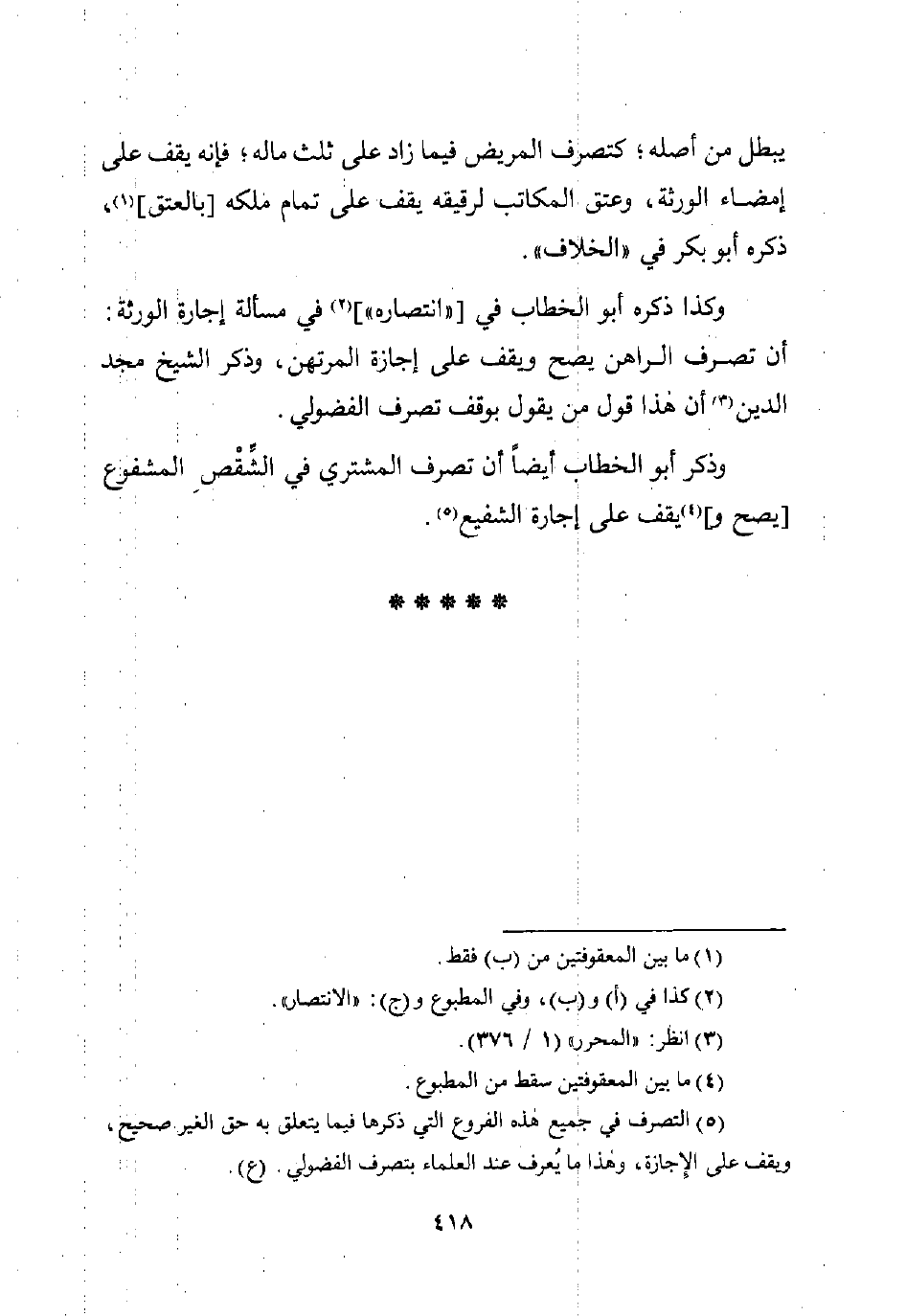 (¬5) التصرف في جميع هذه الفروع التي ذكرها فيما يتعلق به حق الغير صحيح، ويقف علي الإِجازة، وهذا ما يُعرف عند العلماء بتصرف الفضولي. (ع).