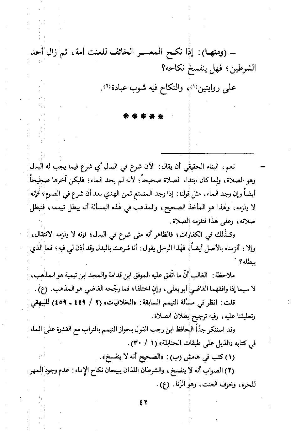 (¬2) الصواب أنه لا ينفسخ، والشرطان اللذان يبيحان نكاح الإماء: عدم وجود المهر للحرة، وخوف العنت، وهو الزِّنا. (ع).