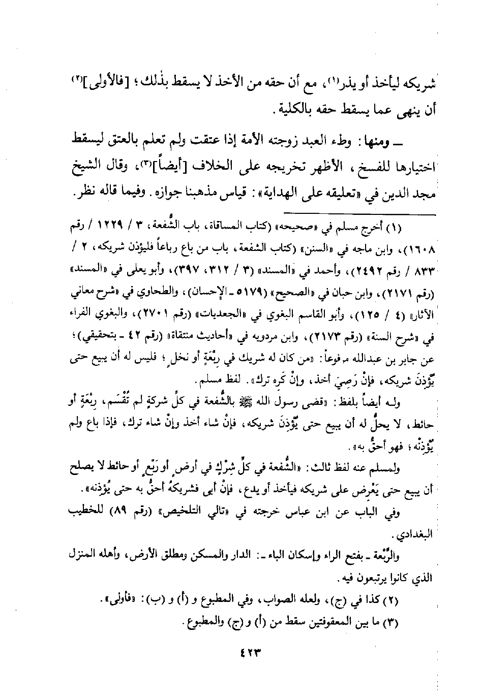 (¬1) أخرج مسلم في "صحيحه" (كتاب المساقاة، باب الشُّفعة، 3/ 1229/ رقم 1608)، وابن ماجه في "السنن" (كتاب الشفعة، باب من باع رباعًا فليؤذن شريكه، 2/ 833/ رقم 2492)، وأحمد في "المسند" (3/ 312، 397)، وأبو يعلى في "المسند" (رقم 2171)، وابن حبان في "الصحيح" (5179 - الإحسان)، والطحاوي في "شرح معاني الآثار" (4/ 125)، وأبو القاسم البغوي في "الجعديات" (رقم 2701)، والبغوي الفراء في "شرح السنة" (رقم 2173)، وابن مردويه في "أحاديث منتقاة" (رقم 42 - بتحقيقي)، عن جابر بن عبد اللَّه مرفوعًا: "من كان له شريك في رِبْعَةٍ أو نخلٍ، فليس له أن يبيع حتى يؤذِنَ شريكه، فإن رَصِيَ أخذ، وإنْ كَرِه ترك". لفظ مسلم.