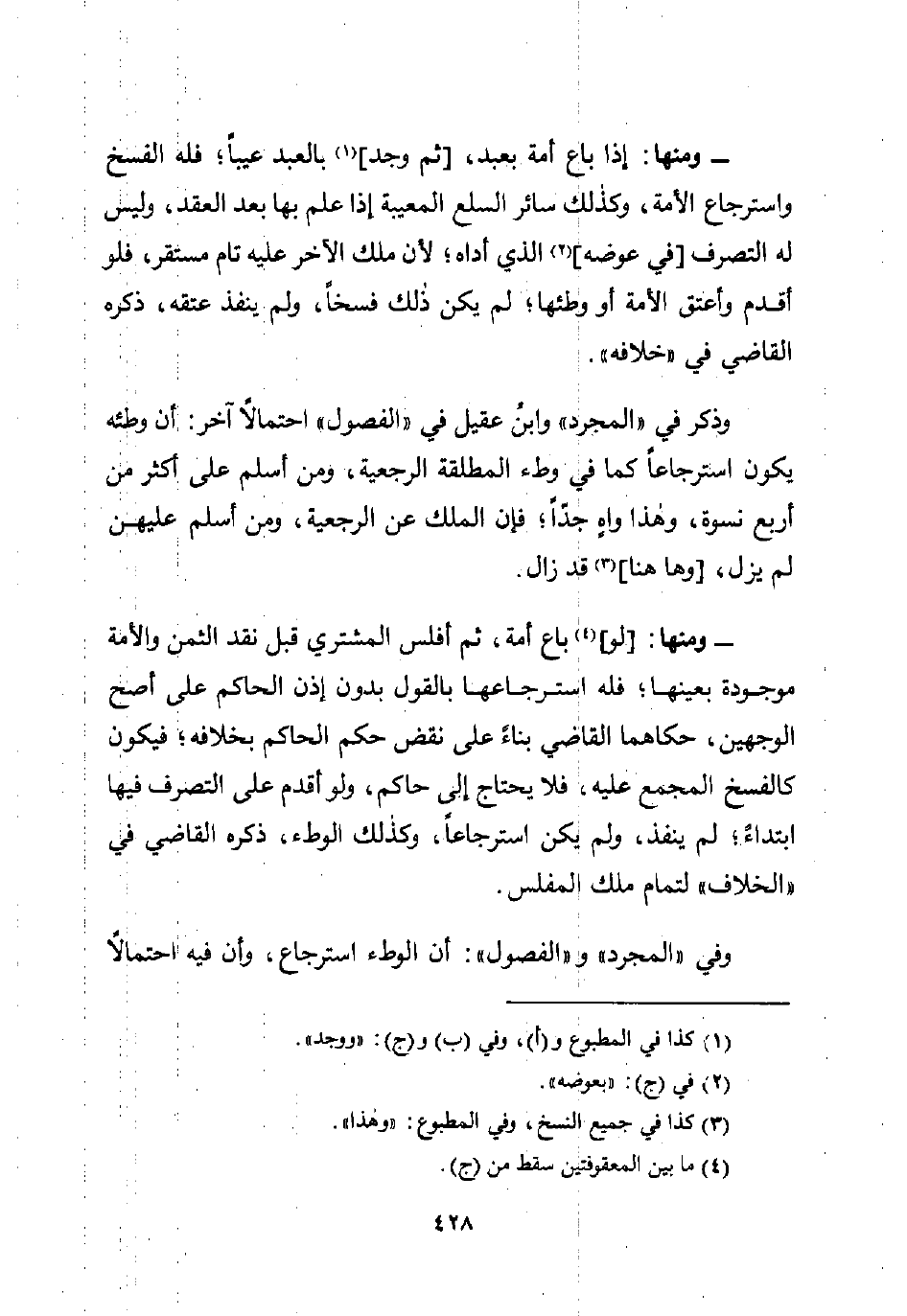 - ومنها: إذا باع أمة بعبد، [ثم وجد] (¬1) بالعبد عيبًا؛ فله الفسخ واسترجاع الأمة، وكذلك سائر السلع المعيبة إذا علم بها بعد العقد، وليس له التصرف [في عوضه] (¬2) الذي أداه؛ لأن ملك الآخر عليه تام مستقر، فلو أقدم وأعتق الأمة أو وطئها؛ لم يكن ذلك فسخًا، ولم ينفذ عتقه، ذكره القاضي في "خلافه".