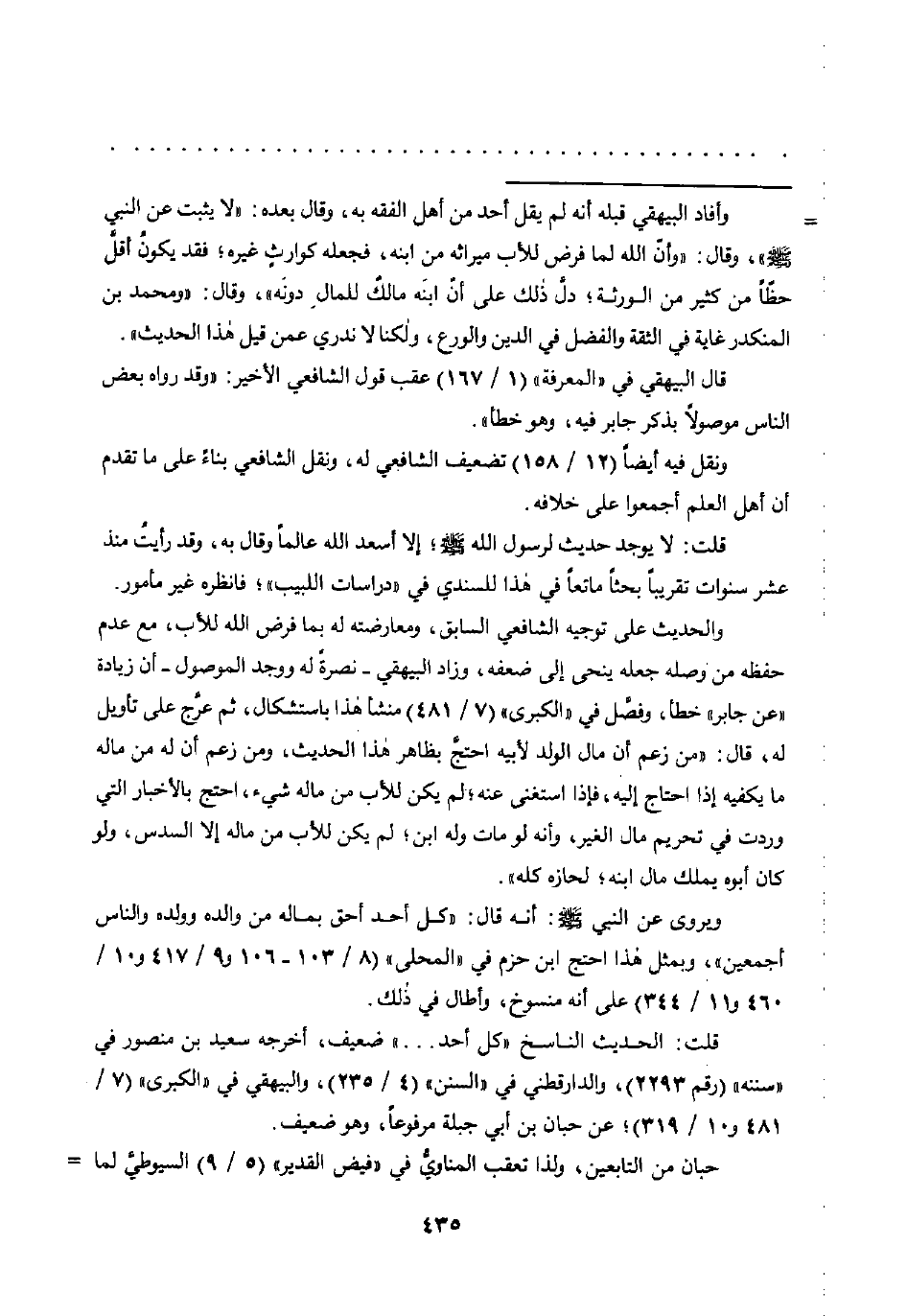 = وأفاد البيهقي قبله أنه لم يقل أحد من أهل الفقه به، وقال بعده: "لا يثبت عن النبي -صلى اللَّه عليه وسلم-"، وقال: "وأنّ اللَّه لما فرض للأب ميراثه من ابنه، فجعله كوارثٍ غيره، فقد يكونُ أقلَّ حظًّا من كثير من الورثة؛ دلَّ ذلك على أنّ ابنه مالكٌ للمالِ دونه"، وقال: "ومحمد بن المنكدر غاية في الثقة والفضل في الدين والورع، ولكنا لا ندري عمن قيل هذا الحديث".