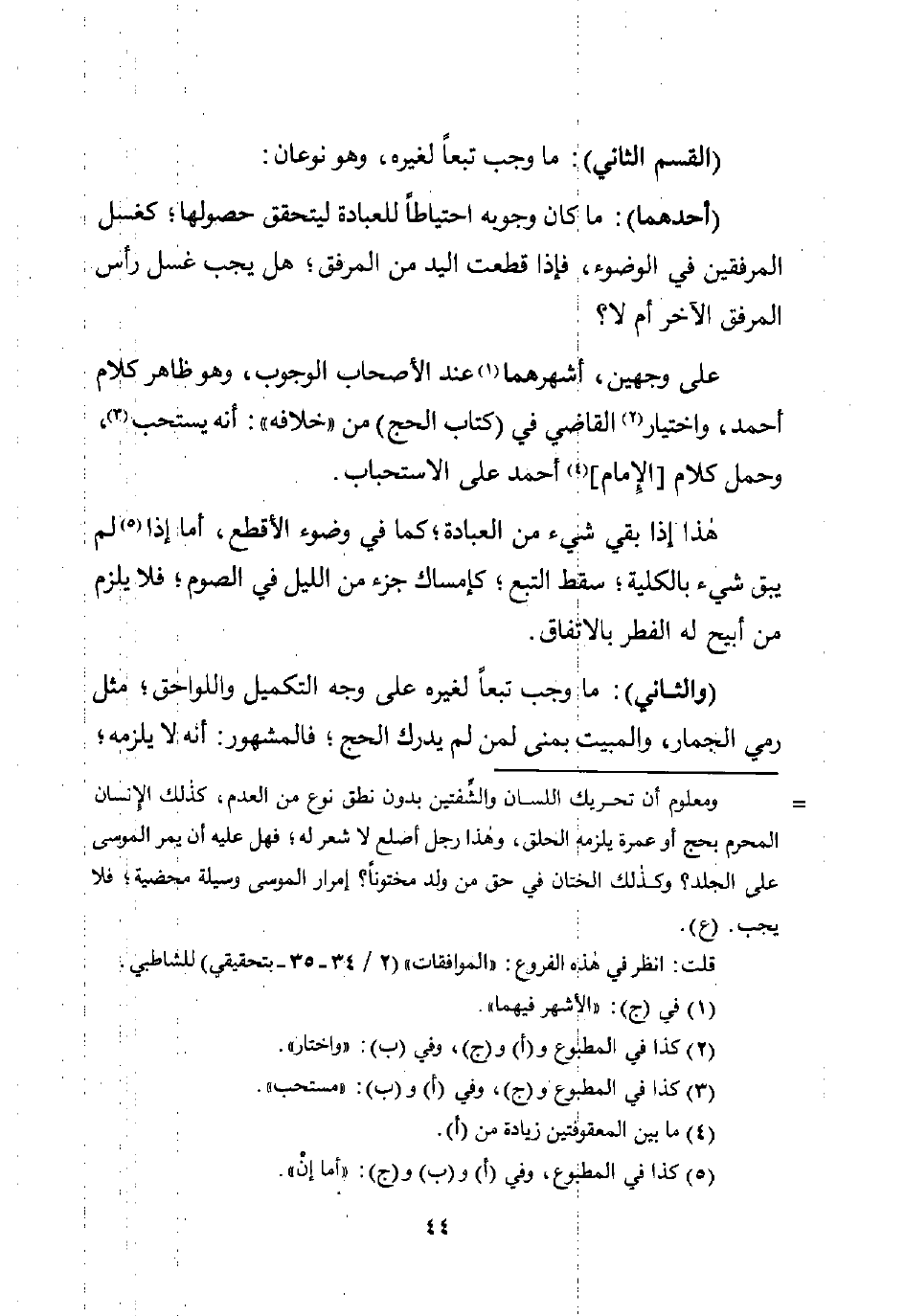 (أحدهما): ما كان وجوبه احتياطًا للعبادة ليتحقق حصولها؛ كغسل المرفقين في الوضوء، فإذا قطعت اليد من المرفق، هل يجب غسل رأس المرفق الآخر أم لا؟