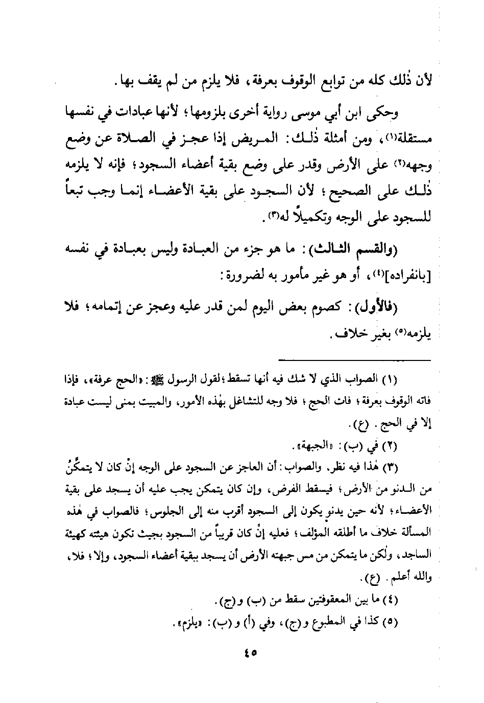 (¬3) هذا فيه نظر. والصواب: أن العاجز عن السجود على الوجه إنْ كان لا يتمكَّنُ من الدنو من الأرض؛ فيسقط الفرض، وإن كان يمكن يجب عليه أن يجد على بقية الأعضاء؛ لأنه حين يدنو يكون إلى السجود أقرب منه إلى الجلوس، فالصواب في هذه المسألة خلاف ما أطلقه المؤلف، فعليه إنْ كان قريبًا من السجود بجيث نكون هيئته كهيئة الساجد، ولكن ما يتمكن من مس جبهته الأرض أن يسجد ببقية أعضاء السجود، وإلا؛ فلا، واللَّه أعلم. (ع).
