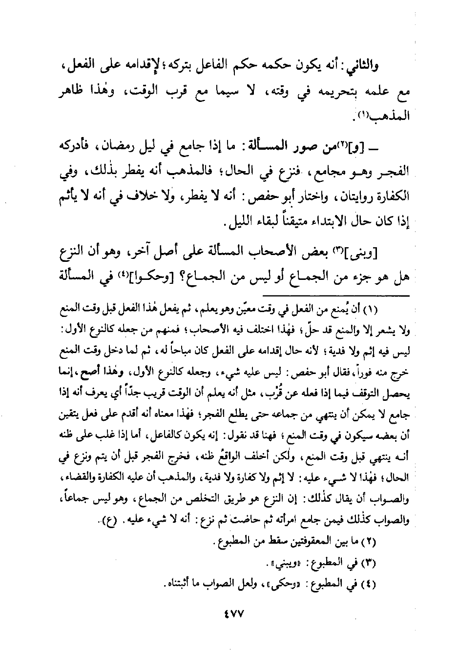 (¬1) أن يُمنع من الفعل في وقت معيّن وهو يعلم، ثم يفعل هذا الفعل قبل وقت المنع ولا يشعر إلا والمنع قد حلّ؛ فهذا اختلف فيه الأصحاب؛ فمنهم من جعله كالنوع الأول: ليس فيه إثم ولا فدية؛ لأنه حال إقدامه على الفعل كان مباحًا له، ثم لما دخل وقت المنع خرج منه فورًا، فقال أبو حفص: ليس عليه شيء، وجعله كالنوع الأول، وهذا أصح، إنما يحصل التوقف فيما إذا فعله عن قُرْب، مثل أنه يعلم أن الوقت قريب جدًّا أي يعرف أنه إذا جامع لا يمكن أن ينتهي من جماعه حتى يطلع الفجر؛ فهذا معناه أنه أقدم على فعل يتقين أن بعضه سيكون في وقت المنع؛ فهنا قد نقول: إنه يكون كالفاعل، أما إذا غلب على ظنه أنه ينتهي قبل وقت المنع، ولكن أخلف الواقعُ ظنه، فخرج الفجر قبل أن يتم ونزع في الحال، فهذا لا شيء عليه: لا إثم ولا كفارة ولا فدية، والمذهب أن عليه الكفارة والقضاء، والصواب أن يقال كذلك: إن النزع هو طريق التخلص من الجماع، وهو ليس جماعًا، والصواب كذلك فيمن جامع امرأته ثم حاضت ثم نزع: أنه لا شيء عليه. (ع).