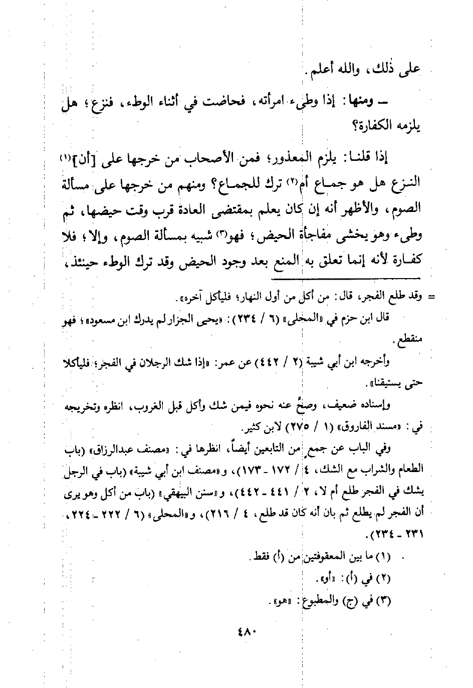 وفي الباب عن جمعٍ من التابعين أيضًا، انظرها في: "مصنف عبد الرزاق" (باب الطعام والشراب مع الشك، 4/ 172 - 173)، و"مصنف ابن أبي شيبة" (باب في الرجل يشك في الفجر طلع أم لا، 2/ 441 - 442)، و"سنن البيهقي" (باب من أكل وهو يرى أن الفجر لم يطلع ثم بان أنه كان قد طلع، 4/ 216)، و"المحلى" (6/ 222 - 224، 231 - 234).