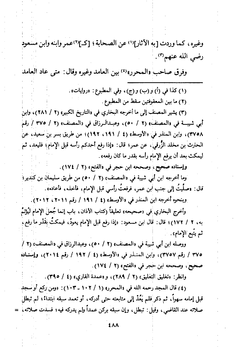 وأخرج البخاري في "صحيحه" تعليقًا (كتاب الأذان، باب إنما جُعل الإمام ليُؤتمَّ به، 2/ 172)، قال: قال ابن مسعود: "إذا رفع قبل الإمام يعودُ، فيمكثُ بقَدْر ما رفع، ثم يتّبع الإمام".