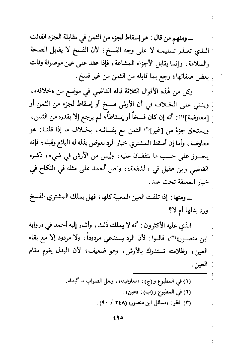 وكل من هذه الأقوال الثلاثة قاله القاضي في موضع من "خلافه"، وينبني على الخلاف في أن الأرش فسخ أو إسقاط لجز من الثمن أو [معاوضة] (¬1): أنه إن كان فسخًا أو إسقاطًا؛ لم يرجع إلا بقدره من الثمن، ويستحق جزءً من [غير] (¬2) الثمن مع بقائه، بخلاف ما إذا قلنا: هو معاوضة، وأما إن أسقط المشتري خيار الرد بعوض بذله له البائع وقبله؛ فإنه يجوز على حسب ما يتفقان عليه، وليس من الأرش في شيء، ذكره القاضي وابن عقيل في "الشفعة"، ونص أحمد على مثله في النكاح في خيار المعتقة تحت عبد.