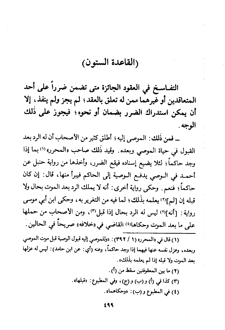 (¬1) قال في "المحرر" (1/ 392): "وللموصي إليه قبول الوصية قبل موت الموصي وبعده، وعزل نفسه عنها فيهما إذا وجد حكمًا، وعنه (أي: عن ابن حامد): ليس له عزلها بعد الموت ولا قبله إذا لم يعلمه بذلك".