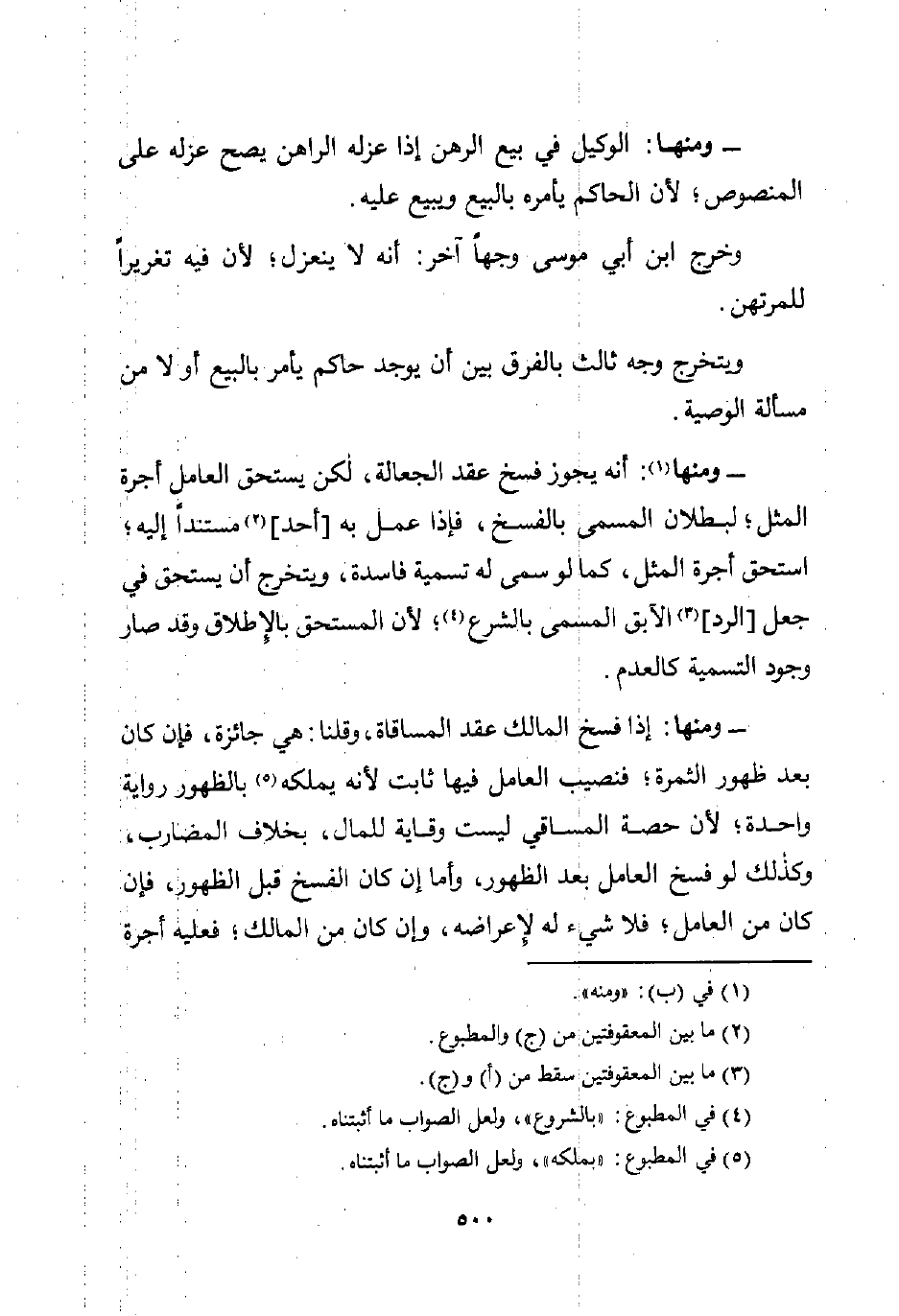 - ومنها: إذا فسخ المالك عقد المساقاة، وقلنا: هي جائزة، فإن كان بعد ظهور الثمرة؛ فنصيب العامل فيها ثابت لأنه يملكه (¬5) بالظهور رواية واحدة؛ لأن حصة المساقي ليست وقاية للمال، بخلاف المضارب، وكذلك لو فسخ العامل بعد الظهور، وأما إن كان الفسخ قبل الظهور، فإن كان من العامل؛ فلا شيء له لإعراضه، وإن كان من المالك؛ فعليه أجرة