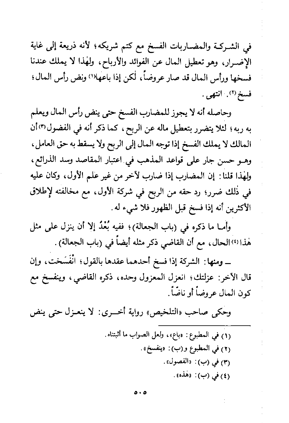 في الشركة والمضاربات الفسخ مع كتم شريكه؛ لأنه ذريعة إلى غاية الإضرار، وهو تعطيل المال عن الفوائد والأرباح، ولهذا لا يملك عندنا فسخها ورأس المال قد صار عروضًا، لكن إذا باعها (¬1) ونض رأس المال؛ فسخ (¬2). انتهى.
