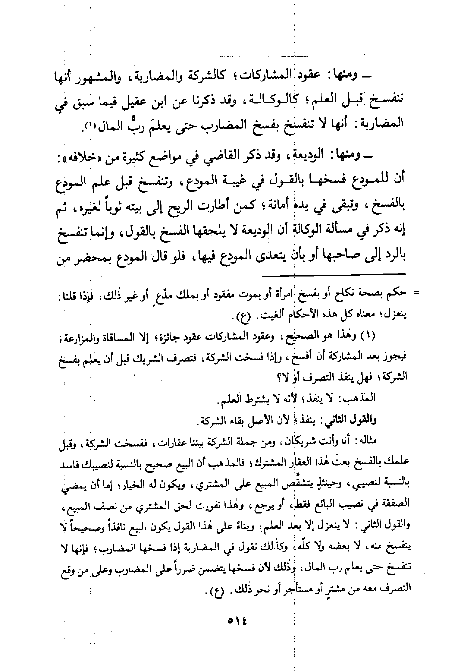 (¬1) وهذا هو الصحيح، وعقود المشاركات عقود جائزة؛ إلا المساقاة والمزارعة؛ فيجوز بعد المشاركة أن أفسخ، وإذا فسخت الشركة، فتصرف الشريك قبل أن يعلم بفسخ الشركة؛ فهل ينفذ التصرف أو لا؟