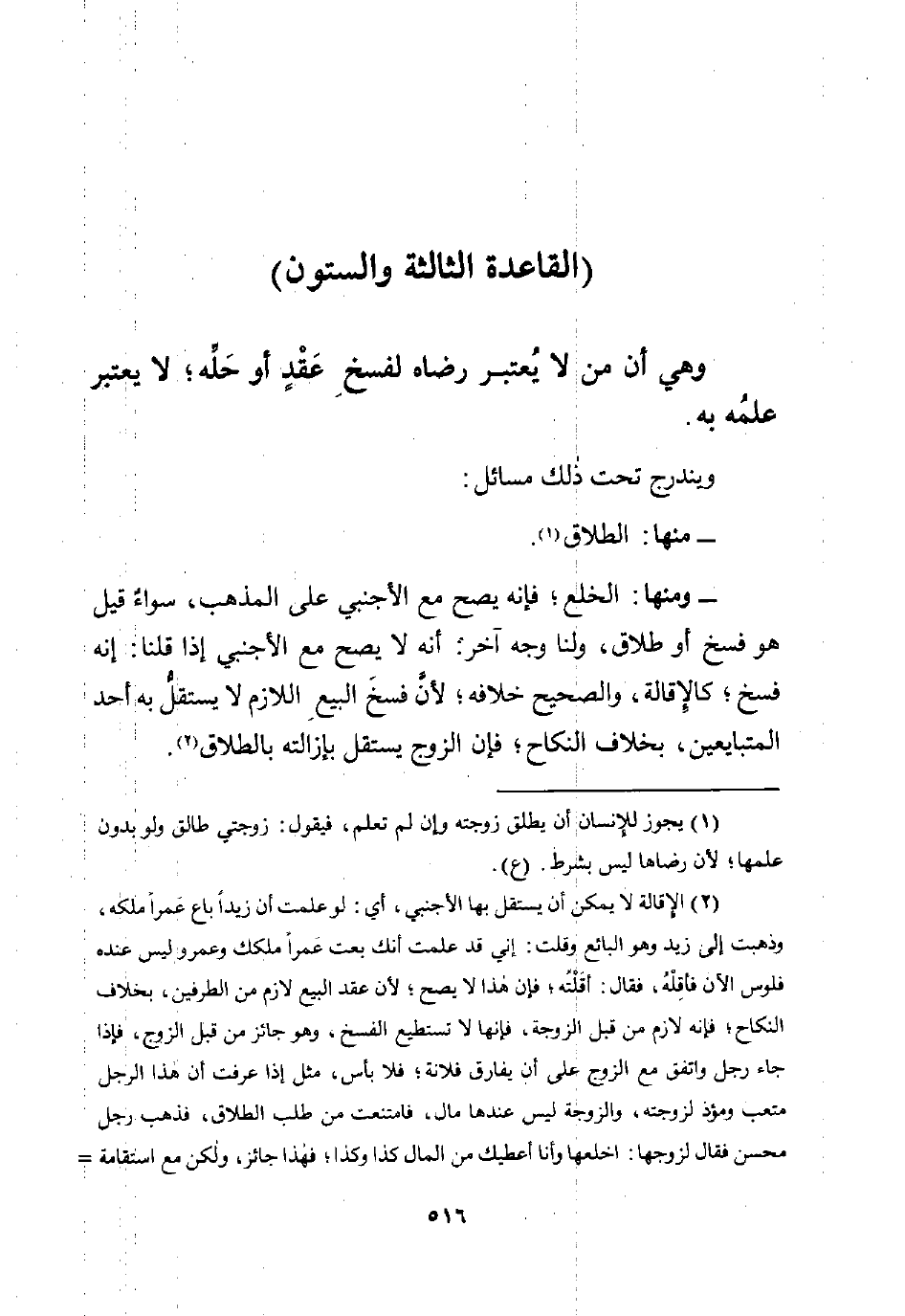 (¬2) الإقالة لا يمكن أن يستقل بها الأجنبي، أي: لو علمت أن زيدًا باع عَمرًا ملكه، وذهبت إلى زيد وهو البائع وقلت: إني قد علمت أنك بعت عَمرًا ملكك وعمرو ليس عنده فلوس الآن فأقِلْهُ، فقال: أقَلْتُه؛ فإن هذا لا يصح؛ لأن عقد البيع لازم من الطرفين، بخلاف النكاح؛ فإنه لازم من قبل الزوجة، فإنها لا تستطيع الفسخ، وهو جائز من قبل الزوج، فإذا جاء رجل واتفق مع الزوج على أن يفارق فلانة؛ فلا بأس، مثل إذا عرفت أن هذا الرجل متعب ومؤذ لزوجته، والزوجة ليس عندها مال، فامتنعت من طلب الطلاق، فذهب رجل محسن فقال لزوجها: اخلعها وأنا أعطيك من المال كذا وكذا؛ فهذا جائز، ولكن مع استقامة =