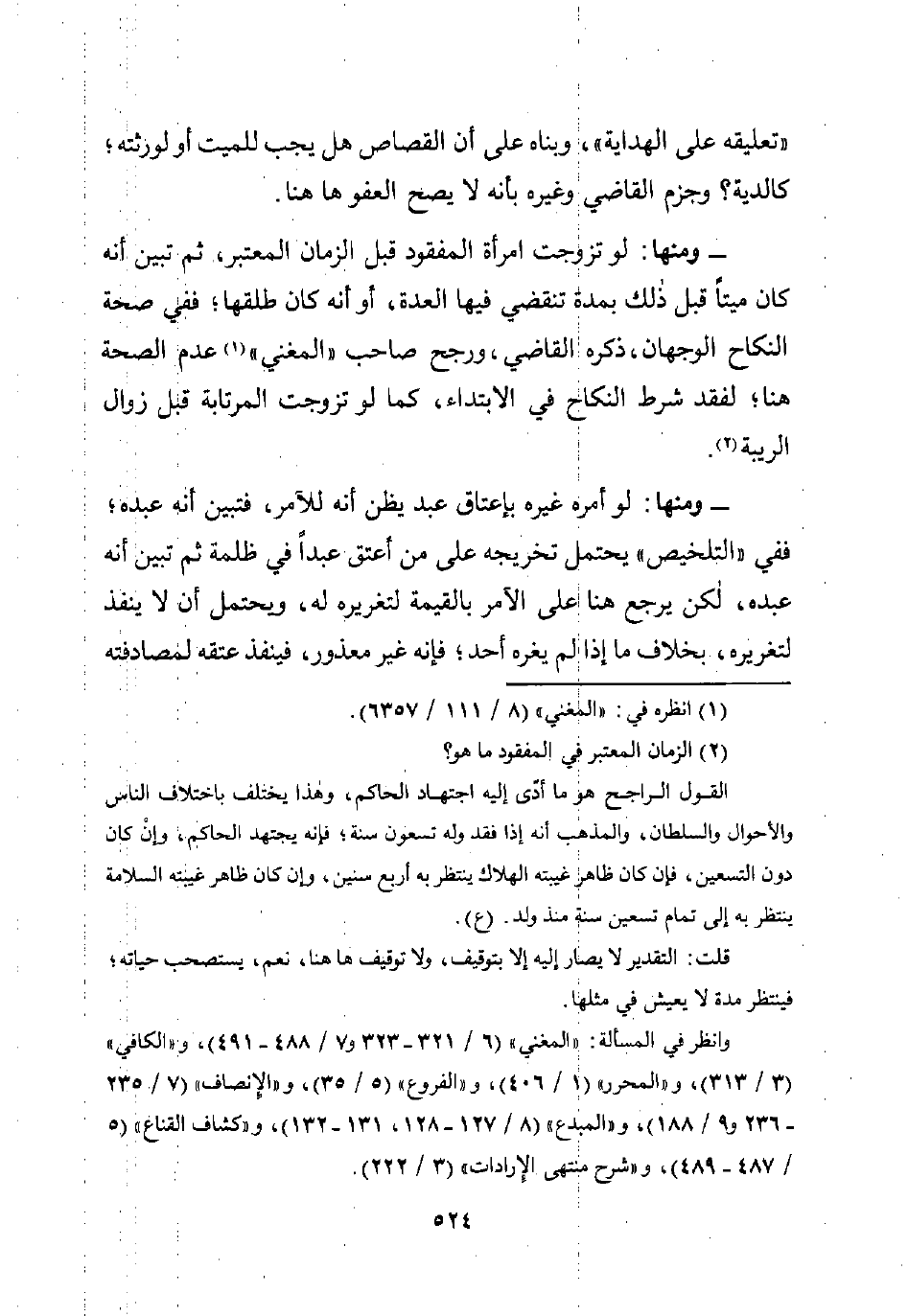 القول الراجح هو ما أدّى إليه اجتهاد الحاكم، وهذا يختلف باختلاف الناس والأحوال والسلطان، والمذهب أنه إذا فقد وله تسعون سنة، فإنه يجتهد الحاكم، وإنْ كان دون التسعين، فإن كان ظاهر غيبته الهلاك ينتظر به أربع سنين، وأن كان ظاهر غيبته السلامة ينتظر به إلى تمام تسعين سنة منذ ولد. (ع).