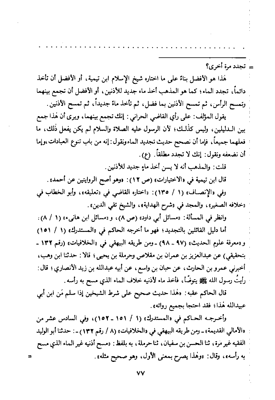 يقول المؤلف: على رأي القاضي الحراني: إنك تجمع بينهما، ويرى أن هذا جمع بين الدليلين، وليس كذلك، لأن الرسول عليه الصلاة والسلام لم يكن يفعل ذلك، ما فعلهما جميعًا، فإما أن نصحح حديث تجديد الماء ونقول: إنه من باب تنوع العبادات، وإما أن نضعفه ونقول: إنك لا تجدد مطلقًا. (ع).