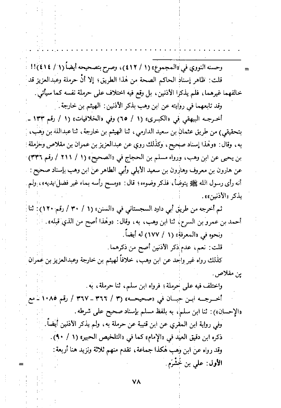 قلت: ظاهر إسناد الحاكم الصحة من هذا الطريق؛ إلا أنَّ حرملة وعبد العزيز قد خالفهما غيرهما، فلم يذكرا الأذنين، بل وقع فيه اختلاف على حرملة نفسه كما سيأتي.