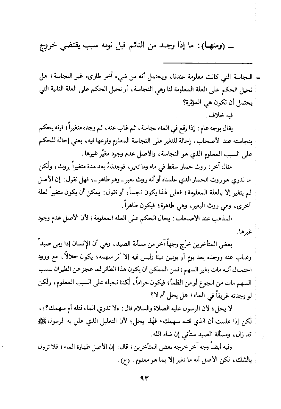 = النجاسة التي كانت معلومة عندنا، ويحتمل أنه من شيء آخر طارئ غير النجاسة؛ هل نحيل الحكم على العلة المعلومة لنا وهي النجاسة، أو نحيل الحكم على العلة الثانية التي يحتمل أن تكون هي المؤثرة؟