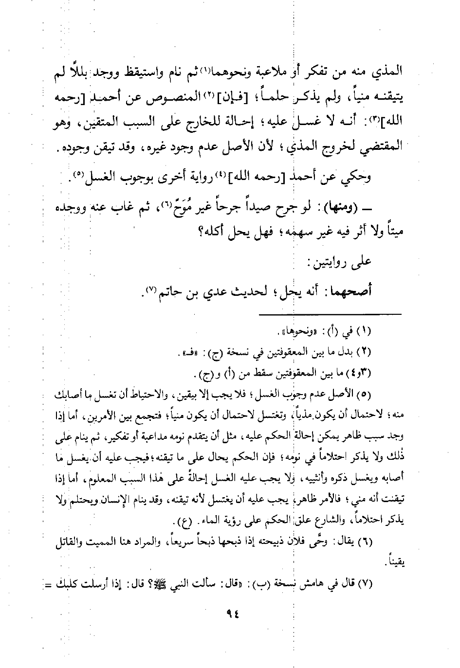 (¬5) الأصل عدم وجوب الغسل، فلا يجب الا بيقين، والاحتياط أن تغسل ما أصابك منه؛ لاحتمال أن يكون مذيًا، وتغتسل لاحتمال أن يكون منيًا؛ فتجمع بين الأمرين، أما إذا وجد سبب ظاهر يمكن إحالة الحكم عليه، مثل أن يتقدم نومه مداعبة أو تفكير، ثم ينام على ذلك ولا يذكر احتلامًا في نومه؛ فإن الحكم يحال على ما تيقنه؛ فيجب عليه أن يغسل ما أصابه ويغسل ذكره وأنثيبه، ولا يجب عليه الغسل إحالةً على هذا السبب المعلوم، أما إذا تيقنت أنه مني؛ فالأمر ظاهر، يجب عليه أن يغتسل لأنه تيقنه، وقد ينام الانسان ويحتلم ولا يذكر احتلامًا، والشارع علق الحكم على رؤية الماء. (ع).