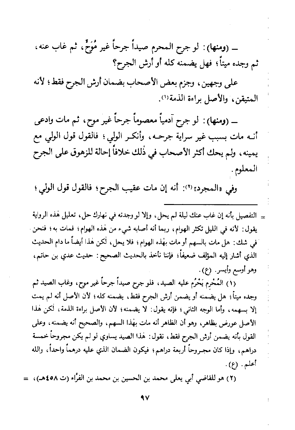 (¬1) المُحْرِم يَحْرم عليه الصيد، فلو جرح صيدًا جرحًا غير موح، وغاب الصيد ثم وجده ميتًا؛ هل يضمنه أو يضمن أرش الجرح فقط، يضمنه كله؛ لأن الأصل أنه لم يمت إلا بسهمه، وأما الوجه الثاني؛ فإنه يقول: لا يضمنه؛ لأن الأصل براءة الذمة، لكن هذا الأصل عورض بظاهر، وهو أن الظاهر أنه مات بهذا السهم، والصحيح أنه يضمنه، وعلى القول بأنه يضمن أرش الجرح فقط، نقول: هذا الصيد يساوي لو لم يكن مجروحًا خمسة دراهم، وإذا كان مجروحًا أربعة دراهم؛ فيكون الضمان الذي عليه درهمًا واحدًا، واللَّه أعلم. (ع).