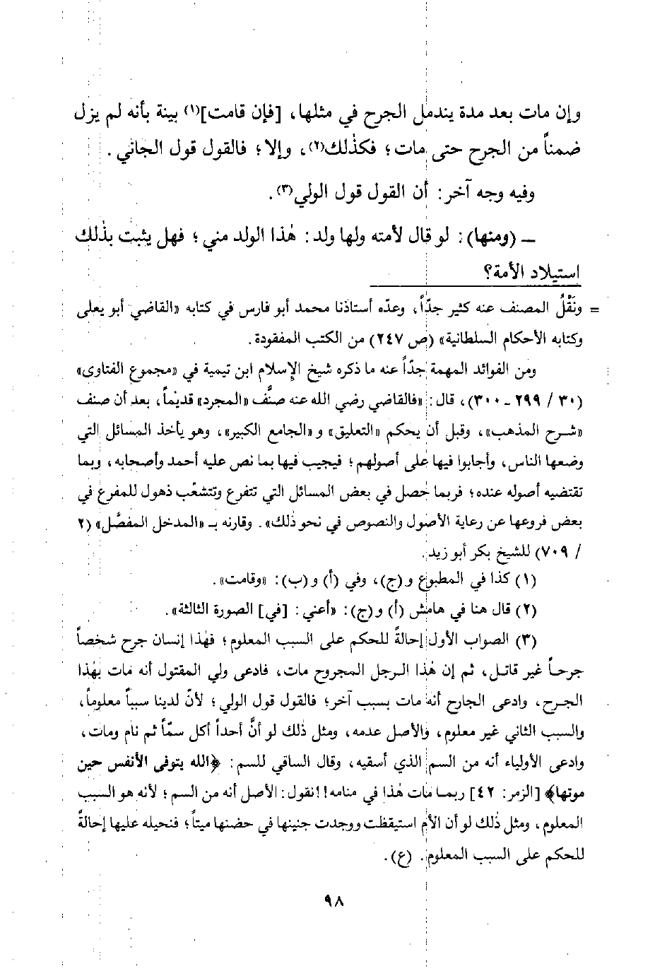 (¬3) الصواب الأول إحالةً للحكم على السبب المعلوم؛ فهذا إنسان جرح شخصًا جرحًا غير قاتل، ثم إن هذا الرجل المجروح مات، فادعى ولي المقتول أنه مات بهذا الجرح، وادعى الجارح أنه مات بسبب آخر؛ فالقول قول الولي؛ لأنّ لدينا سببًا معلومًا، والسبب الثاني غير معلوم، والأصل عدمه، ومثل ذلك لو أنَّ أحدًا أكل سمًّا ثم نام ومات، وادعى الأولياء أنه من السم الذي أسقيه، وقال الساقي للسم {اللَّهُ يَتَوَفَّى الْأَنْفُسَ حِينَ مَوْتِهَا} [الزمر: 42] ربما مات هذا في منامه!! نقول: الأصل أنه من السم؛ لأنه هو السبب المعلوم، ومثل ذلك لو أن الأم استيقظت ووجدت جنينها في حضنها ميتًا؛ فنحيله عليها إحالةً للحكم على السبب المعلوم. (ع).