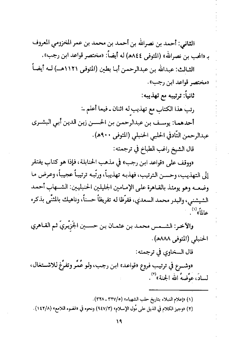 "ووقف على "قواعد ابن رجب" في مذهب الحنابلة، فإذا هو كتاب يفتقر إلى التهذيب، وحسن الترتيب، فهذبه تهذيبًا، ورتّبه ترتيبًا عجيبًا، وعرض ما وضعه وهو يومئذ بالقاهرة على الإمامين الجليلين الحنبليين: الشهاب أحمد الشيشني، والبدر محمد السعدي، فقرَّظا له تقريظًا حسنًا، وناهيك بالمثنَّى بذكره عالمًا" (¬1).
