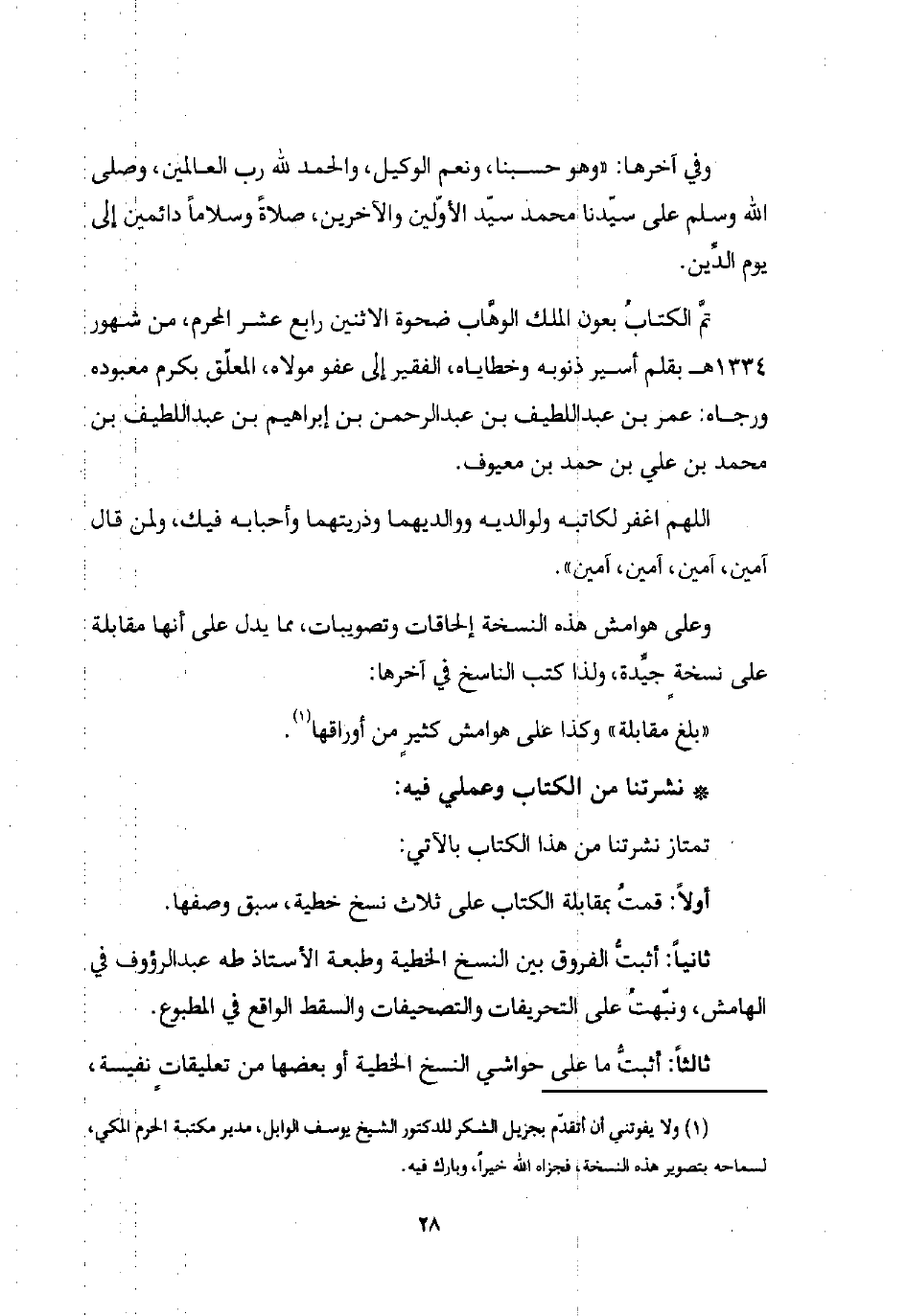 ثانيًا: أثبتُّ الفروق بين النسخ الخطية وطبعة الأستاذ طه عبد الرؤوف في الهامش، ونبّهتُ على التحريفات والتصحيفات والسقط الواقع في المطبوع.