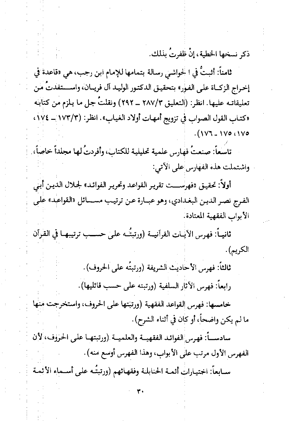 ثامنًا: أثبتُّ في الحواشي رسالة بتمامها للإمام ابن رجب، هي "قاعدة في إخراج الزكاة على الفور" بتحقيق الدكتور الوليد آل فريان، واستفدتُ من تعليقاته عليها. انظر: (التعليق 3/ 287 - 292) ونقلتُ جل ما يلزم من كتابه "كتاب القول الصواب في تزويج أمهات أولاد الغياب". انظر: (3/ 173 - 174، 175، 175 - 176).