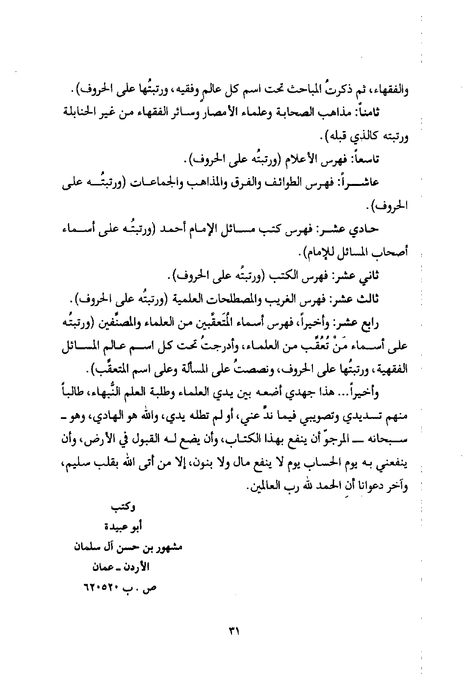 والفقهاء، ثم ذكرتُ المباحث تحت اسم كل عالمٍ وفقيه، ورتبتُها على الحروف).