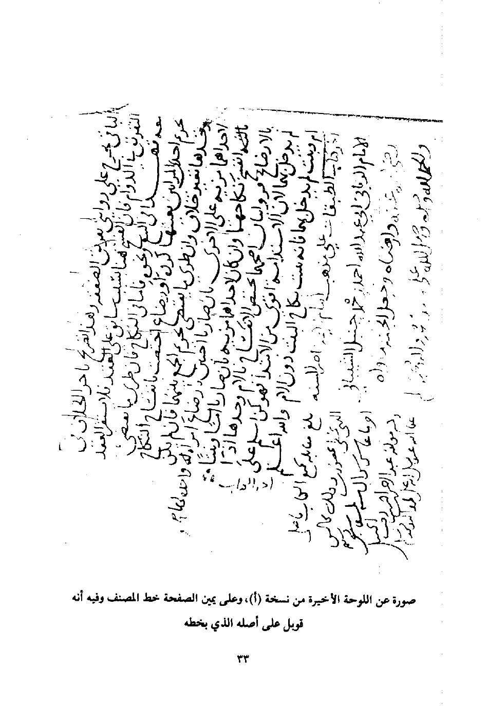 صورة عن اللوحة الأخيرة من نسخة (أ)، وعلى يمين الصفحة خط المصنف وفيه أنه قوبل على أصله الذي بخطه