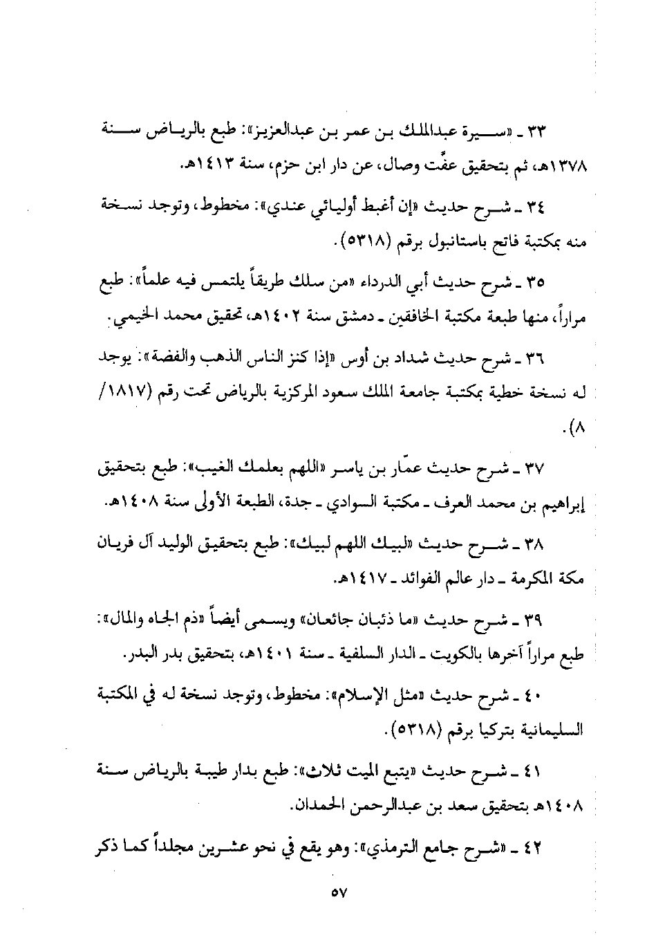36 - شرح حديث شداد بن أوس "إذا كنز الناس الذهب والفضة": يوجد له نسخة خطية بمكتبة جامعة الملك سعود المركزية بالرياض تحت رقم (1817/ 8).