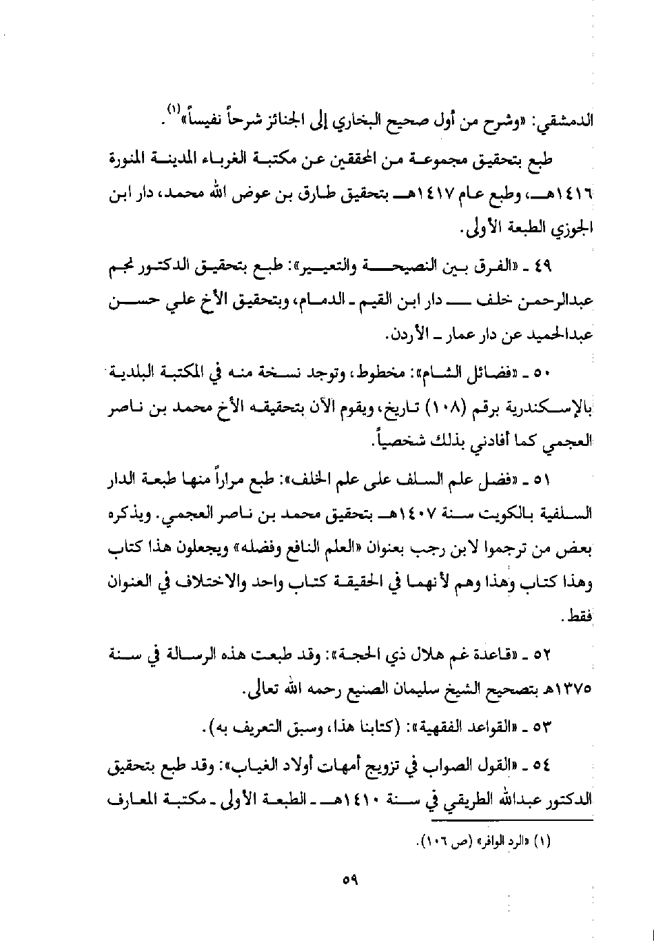 49 - "الفرق بين النصيحة والتعيير": طبع بتحقيق الدكتور نجم عبد الرحمن خلف -دار ابن القيم- الدمام، وبتحقيق الأخ علي حسن عبد الحميد عن دار عمار - الأردن.