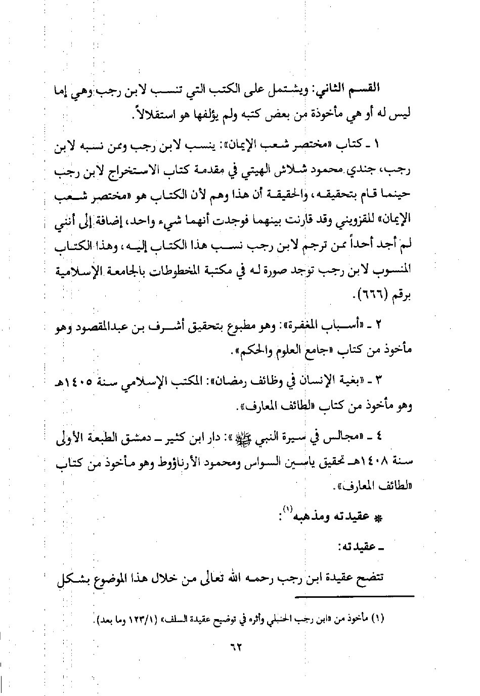القسم الثاني: ويشتمل على الكتب التي تنسب لابن رجب وهي إما ليس له أو هي مأخوذة من بعض كتبه ولم يؤلفها هو استقلالًا.
