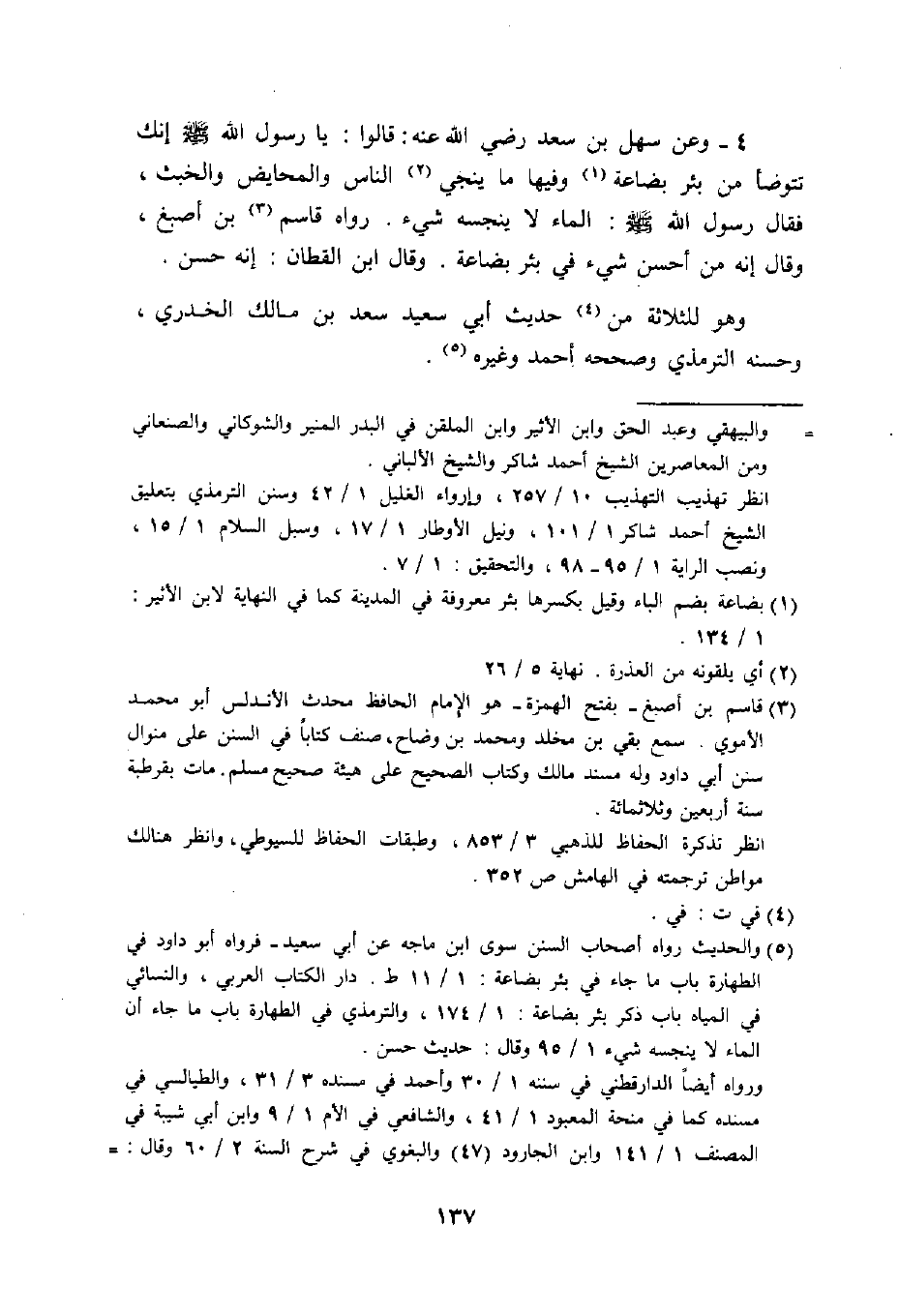 صَحِيحا أَو حسنا دون الضَّعِيف وَرُبمَا ذكرت شَيْئا مِنْهُ لشدَّة الْحَاجة إِلَيْهِ منبها عَلَى ضعفه مُشِيرا بِقَوْلِي مُتَّفق عَلَيْهِ لما رَوَاهُ البُخَارِيّ وَمُسلم فِي صَحِيحهمَا وبقولي رَوَاهُ الْأَرْبَعَة لما رَوَاهُ أَبُو دَاوُد وَالتِّرْمِذِيّ وَالنَّسَائِيّ وَابْن مَاجَه فِي سُنَنهمْ وبقولي رَوَاهُ الثَّلَاثَة لَهُم خلا ابْن مَاجَه وَمَا عدا ذَلِك أوضح من رَوَاهُ كالشافعي وَأحمد والدارمي فِي مسانيدهم وَابْن خُزَيْمَة وَابْن حبَان وَأبي عوَانَة فِي صحاحهم وَالْحَاكِم فِي مُسْتَدْركه وَالدَّارقطني وَالْبَيْهَقِيّ فِي سُنَنهمَا وَغَيرهم كَمَا ستراه وَاضحا إِن شَاءَ الله تَعَالَى وأقتصر فِيمَا أوردهُ من قسم الصَّحِيح وَالْحسن عَلَى الْأَصَح وَالْأَحْسَن مِمَّا رَوَى فِيهِ وَرُبمَا نبهت مَعَ الْأَصَح وَالْأَحْسَن عَلَى الصَّحِيح وَالْحسن كَمَا فعلت فِي أَوَائِل كتاب الطَّهَارَة حَيْثُ ذكرت حَدِيث هُوَ الطّهُور مَاؤُهُ الْحل ميتَته أَولا من حَدِيث جَابر ثمَّ عروته إِلَى رُوَاته الإِمَام أَحْمد وَابْن مَاجَه وَابْن حبَان وَأَن ابْن السكن قَالَ إِنَّه أصح مَا رُوِيَ فِي الْبَاب ثمَّ قلت بعده وَهُوَ للأربعة من حَدِيث أبي هُرَيْرَة وَأَن التِّرْمِذِيّ وَغَيره صَححهُ وَكَذَا حَدِيث بِئْر بضَاعَة حَيْثُ أخرجته أَولا من حَدِيث سهل بن سعد السَّاعِدِيّ وعزوته إِلَى رِوَايَة قَاسم بن أصبغ ثمَّ قلت بعد ذَلِك وَهُوَ للثَّلَاثَة من حَدِيث أبي سعيد الْخُدْرِيّ وَأَنه صحّح وَحسن إِلَى غير ذَلِك من الْمَوَاضِع الْآتِيَة