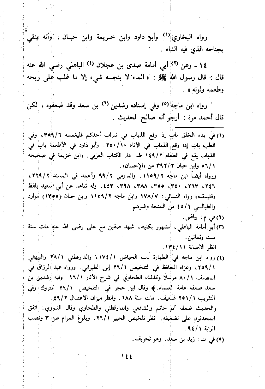 4 - وَعَن سهل بن سعد رَضِيَ اللَّهُ عَنْه قَالُوا يَا رَسُول الله صَلَّى اللَّهُ عَلَيْهِ وَسَلَّم َ إِنَّك تتوضأ من بِئْر بضَاعَة وفيهَا مَا يُنجي النَّاس والمحايض والخبث فَقَالَ رَسُول الله صَلَّى اللَّهُ عَلَيْهِ وَسَلَّم َ المَاء لَا يُنجسهُ شَيْء رَوَاهُ قَاسم بن أصْبع وَقَالَ إِنَّه من أحسن شَيْء فِي بِئْر بضَاعَة وَقَالَ ابْن الْقطَّان إِنَّه حسن وَهُوَ للثَّلَاثَة من حَدِيث أبي سعيد سعد بن مَالك الْخُدْرِيّ وَحسنه التِّرْمِذِيّ وَصَححهُ أَحْمد غَيره