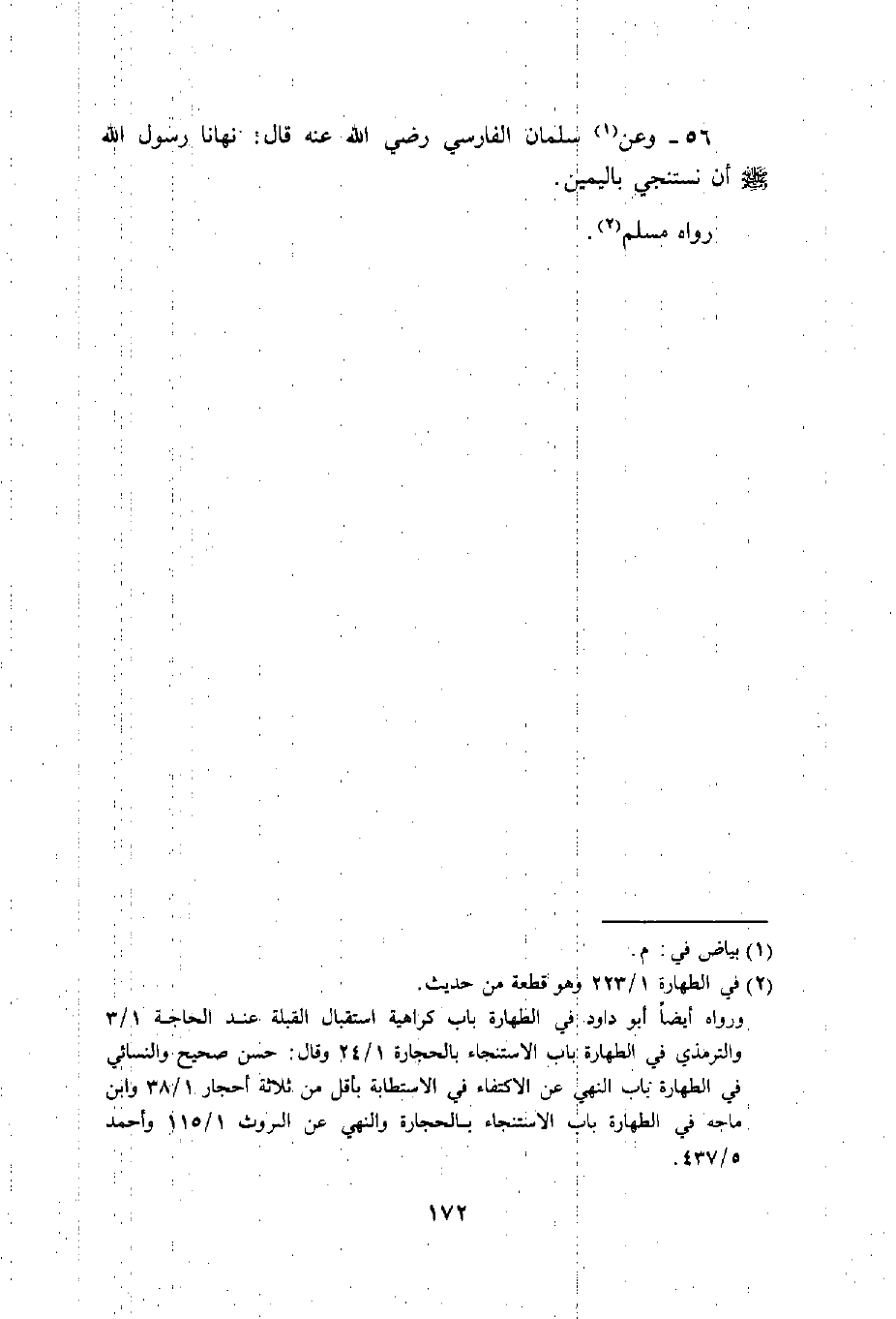 46 - وَعَن ابْن عَبَّاس رَضِيَ اللَّهُ عَنْه قَالَ مر النَّبِي صَلَّى اللَّهُ عَلَيْهِ وَسَلَّم َ بقبرين وَقَالَ إنَّهُمَا ليعذبان وَمَا يعذبان فِي كَبِير كَانَ أَحدهمَا لَا يسْتَتر من الْبَوْل وَأما الاخر فَكَانَ يمشي بالنميمة فَأخذ جَرِيدَة رطبَة فَشَقهَا نِصْفَيْنِ فغرز فِي كل قبر وَاحِدَة فَقَالُوا يَا رَسُول الله لم فعلت هَذَا قَالَ لَعَلَّه يُخَفف عَنْهُمَا مَا لم ييبسا