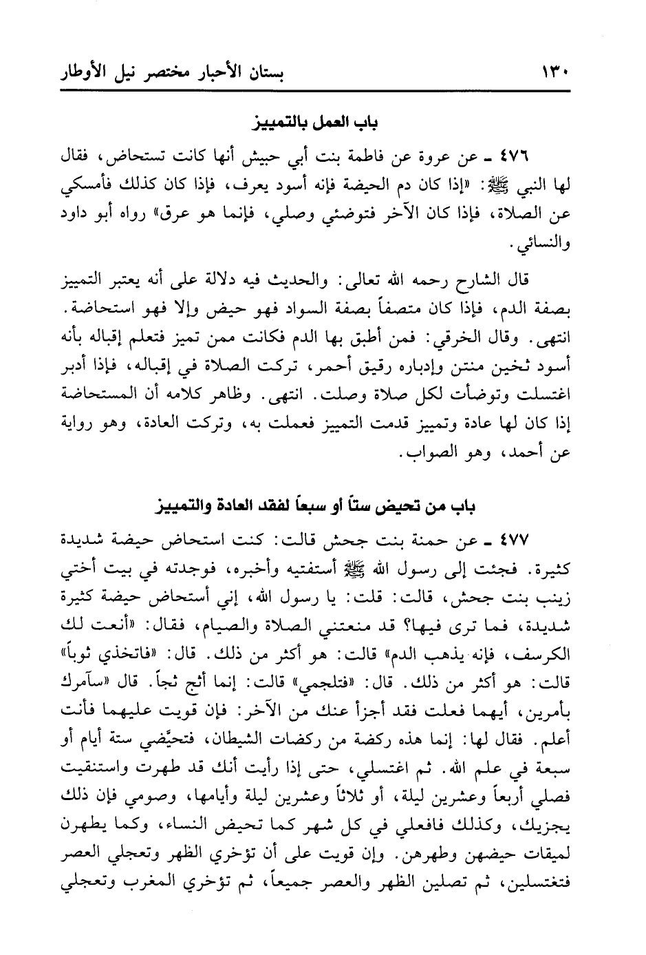 477- عَنْ حَمْنَةَ بِنْتِ جَحْشٍ قَالَتْ: كُنْتُ أُسْتَحَاضُ حَيْضَةً شَدِيدَةً كَثِيرَةً، فَجِئْتُ إلَى رَسُولِ اللَّهِ - صلى الله عليه وسلم - أَسْتَفْتِيهِ وَأُخْبِرُهُ، فَوَجَدْتُهُ فِي بَيْتِ أُخْتِي زَيْنَبَ بِنْتِ جَحْشٍ قَالَتْ: قُلْتُ يَا رَسُولَ اللَّهِ إنِّي أُسْتَحَاضُ حَيْضَةً كَثِيرَةً شَدِيدَةً فَمَا تَرَى فِيهَا؟ قَدْ مَنَعَتْنِي الصَّلَاةَ وَالصِّيَامَ فَقَالَ: «أَنْعَتُ لَكِ الْكُرْسُفَ فَإِنَّهُ يُذْهِبُ الدَّمَ» . قَالَتْ: هُوَ أَكْثَرُ مِنْ ذَلِكَ. قَالَ: «فَاِتَّخِذِي ثَوْبًا» . قَالَتْ: هُوَ أَكْثَرُ مِنْ ذَلِكَ. قَالَ: «فَتَلَجَّمِيْ» . قَالَتْ: إنَّمَا أَثُجُّ ثَجًّا، فَقَالَ: «سَآمُرُكِ بِأَمْرَيْنِ أَيُّهُمَا فَعَلْتِ فَقَدْ أَجْزَأَ عَنْكِ مِنْ الْآخَرِ، فَإِنْ قَوِيتَ عَلَيْهِمَا فَأَنْتَ أَعْلَمُ» . فَقَالَ لَهَا: «إنَّمَا هَذِهِ رَكْضَةٌ مِنْ رَكَضَاتِ الشَّيْطَانِ
