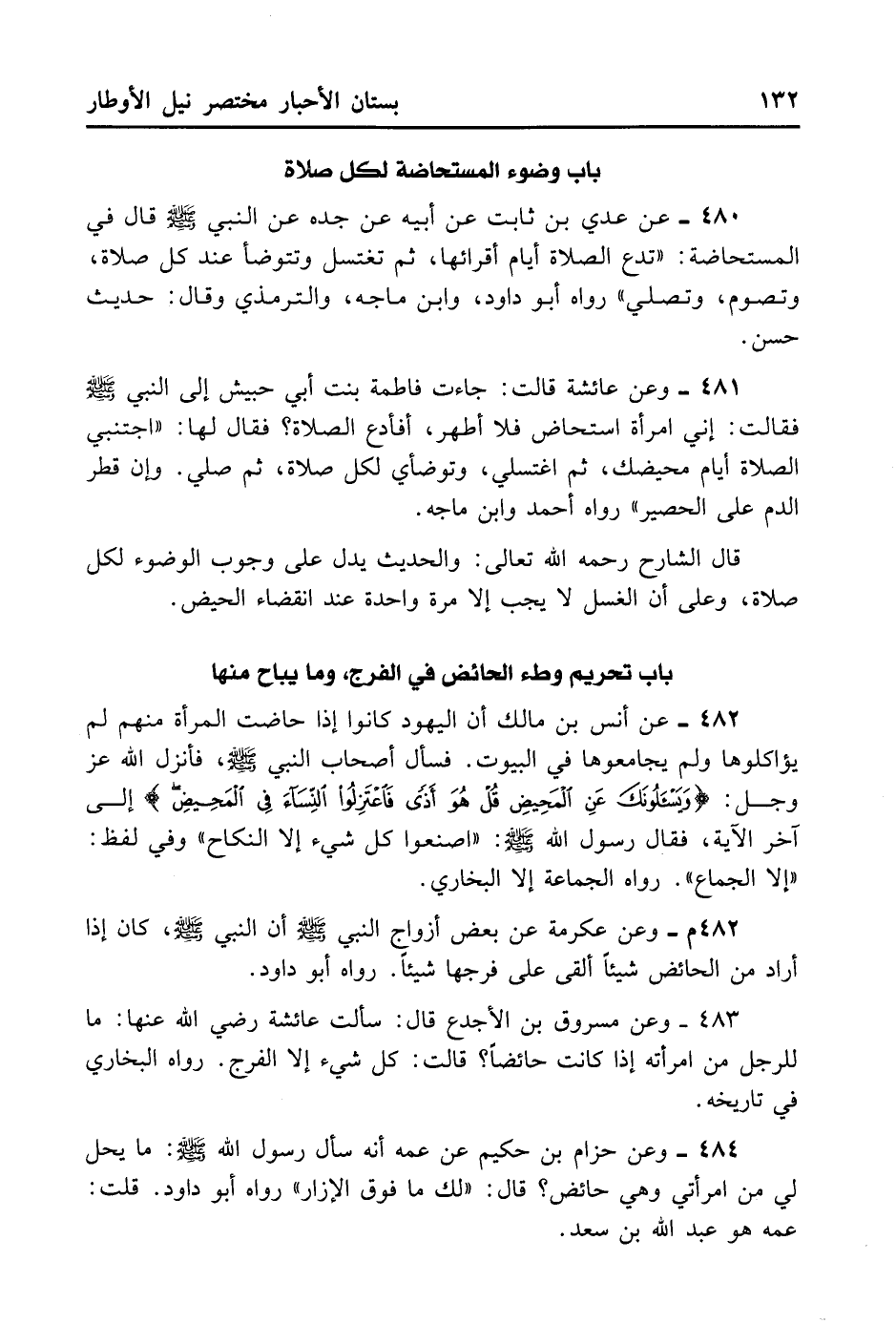 480- عَنْ عَدِيِّ بْنِ ثَابِتٍ عَنْ أَبِيهِ عَنْ جَدِّهِ أَنَّ النَّبِيَّ - صلى الله عليه وسلم - قَالَ فِي الْمُسْتَحَاضَةِ: «تَدْعُ الصَّلَاةَ أَيَّامَ أَقْرَائِهَا ثُمَّ تَغْتَسِلُ وَتَتَوَضَّأُ عِنْدَ كُلِّ صَلَاةٍ وَتَصُومُ وَتُصَلِّي» . رَوَاهُ أَبُو دَاوُد وَابْنُ مَاجَهْ وَالتِّرْمِذِيُّ وَقَالَ: حَسَنٌ.
