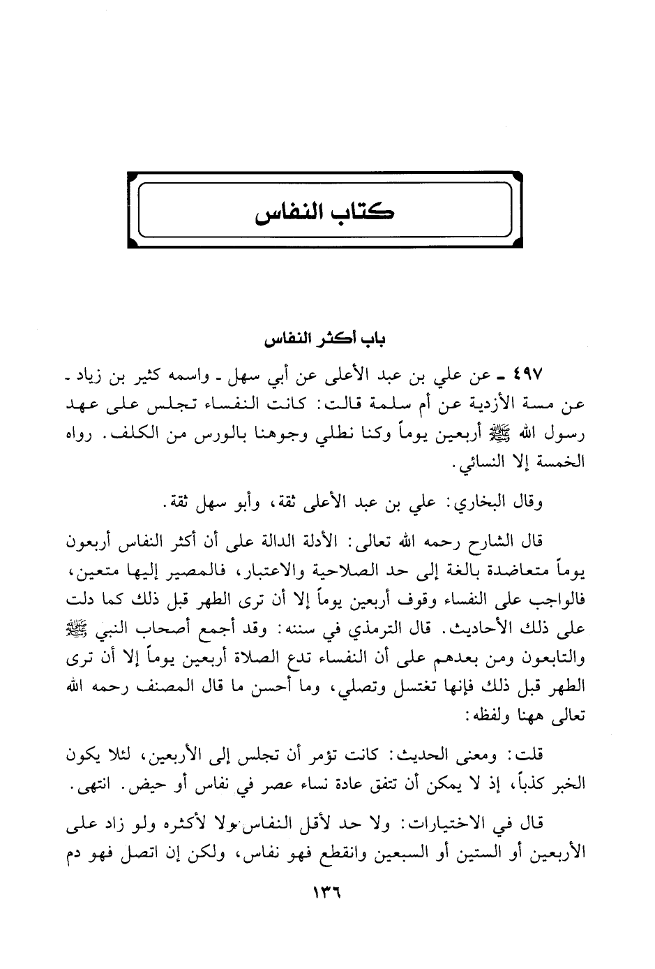 497- عَنْ عَلِيِّ بْنِ عَبْدِ الْأَعْلَى عَنْ أَبِي سَهْلٍ - وَاسْمُهُ كَثِيرُ بْن زِيَادٍ - عَنْ مَسَّةَ الْأَزْدِيَّةِ عَنْ أُمِّ سَلَمَةَ قَالَتْ: كَانَتْ النُّفَسَاءُ تَجْلِسُ عَلَى عَهْدِ رَسُولِ اللَّهِ - صلى الله عليه وسلم - أَرْبَعِينَ يَوْمًا وَكُنَّا نَطْلِي وُجُوهَنَا بِالْوَرْسِ مِنْ الْكَلَفِ. رَوَاهُ الْخَمْسَةُ إلَّا النَّسَائِيّ.