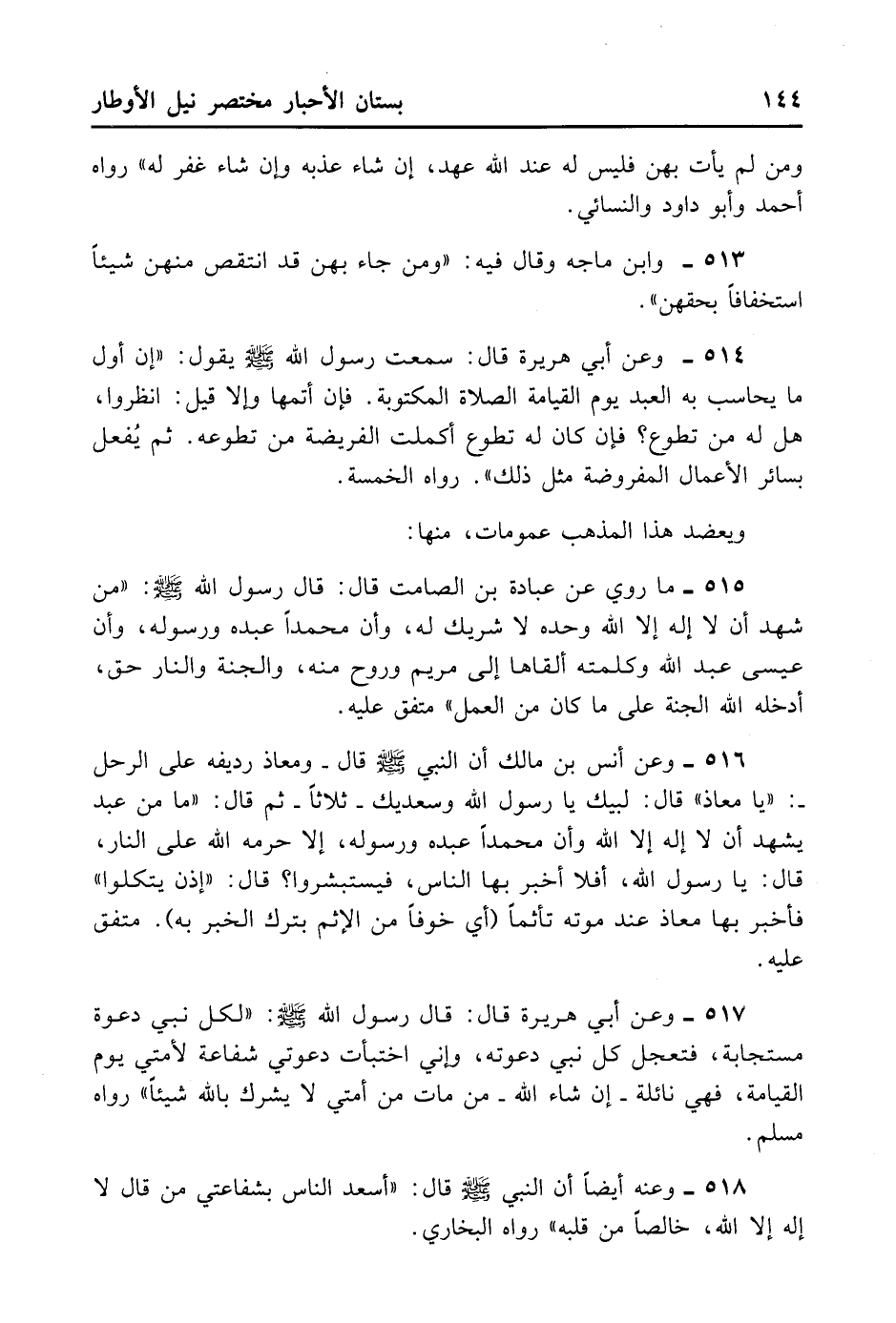 516- وَعَنْ أَنَسِ بْنِ مَالِكٍ أَنَّ النَّبِيَّ - صلى الله عليه وسلم - قَالَ - وَمُعَاذٌ رَدِيفُهُ عَلَى الرَّحْلِ -: «يَا مُعَاذُ» . قَالَ: لَبَّيْكَ يَا رَسُولَ اللَّهِ وَسَعْدَيْكَ - ثَلَاثًا -. ثُمَّ قَالَ: «مَا مِنْ عَبْدٍ يَشْهَدُ أَنْ لَا إلَهَ إلَّا اللَّهُ وَأَنَّ مُحَمَّدًا عَبْدُهُ وَرَسُولُهُ، إلَّا حَرَّمَهُ اللَّهُ عَلَى النَّارِ» . قَالَ: يَا رَسُولَ اللَّهِ أَفَلَا أُخْبِرُ بِهَا النَّاسَ فَيَسْتَبْشِرُوا؟ قَالَ: ... «إذَنْ يَتَّكِلُوا» . فَأَخْبَرَ بِهَا مُعَاذٌ عِنْدَ مَوْتِهِ تَأَثُّمًا: (أَيْ خَوْفًا مِنْ الْإِثْمِ بِتَرْكِ الْخَبَرِ بِهِ) . مُتَّفَقٌ عَلَيْهِ.