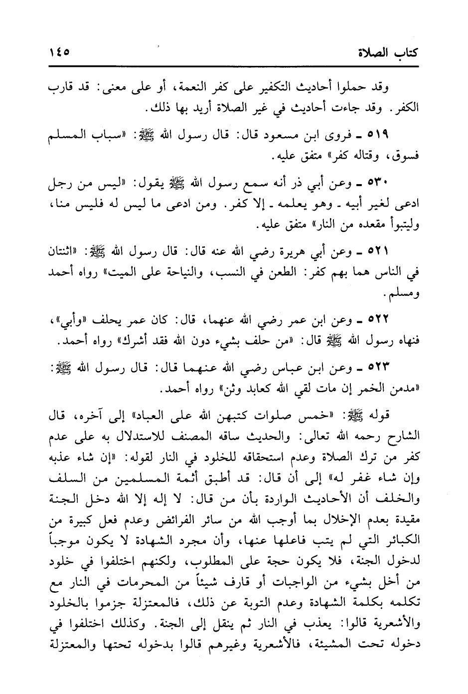 وَقَدْ حَمَلُوا أَحَادِيثَ التَّكْفِيرِ عَلَى كُفْرِ النِّعْمَةِ أَوْ عَلَى مَعْنى قَدْ قَارَبَ الْكُفْرَ، وَقَدْ جَاءَتْ أَحَادِيثُ فِي غَيْرِ الصَّلَاةِ أُرِيدَ بِهَا ذَلِكَ.