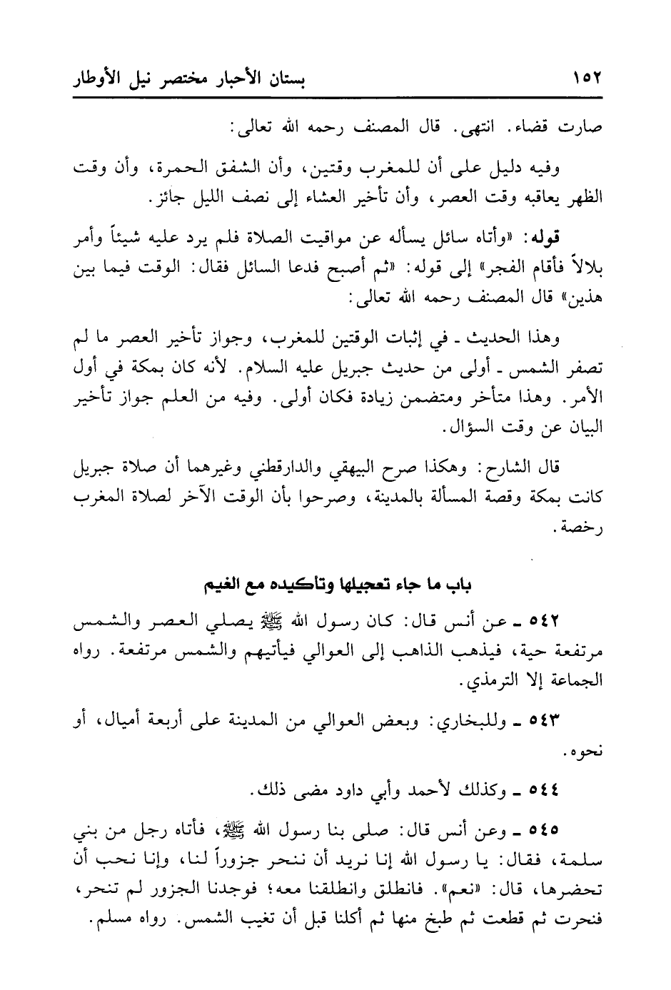 545- وَعَنْ أَنَسٍ قَالَ: صَلَّى بِنَا رَسُولُ اللَّهِ - صلى الله عليه وسلم - الْعَصْرَ فَأَتَاهُ رَجُلٌ مِنْ بَنِي سَلِمَةَ، فَقَالَ: يَا رَسُولَ اللَّهِ إنَّا نُرِيدُ أَنْ نَنْحَرَ جَزُورًا لَنَا وَإِنَّا نُحِبُّ أَنْ تَحْضُرَهَا قَالَ: «نَعَمْ» . فَانْطَلَقَ وَانْطَلَقْنَا مَعَهُ، فَوَجَدْنَا الْجَزُورَ لَمْ تُنْحَرْ فَنُحِرَتْ ثُمَّ قُطِّعَتْ ثُمَّ طُبِخَ مِنْهَا ثُمَّ أَكَلْنَا قَبْلَ أَنْ تَغِيبَ الشَّمْسُ. رَوَاهُ مُسْلِمٌ.