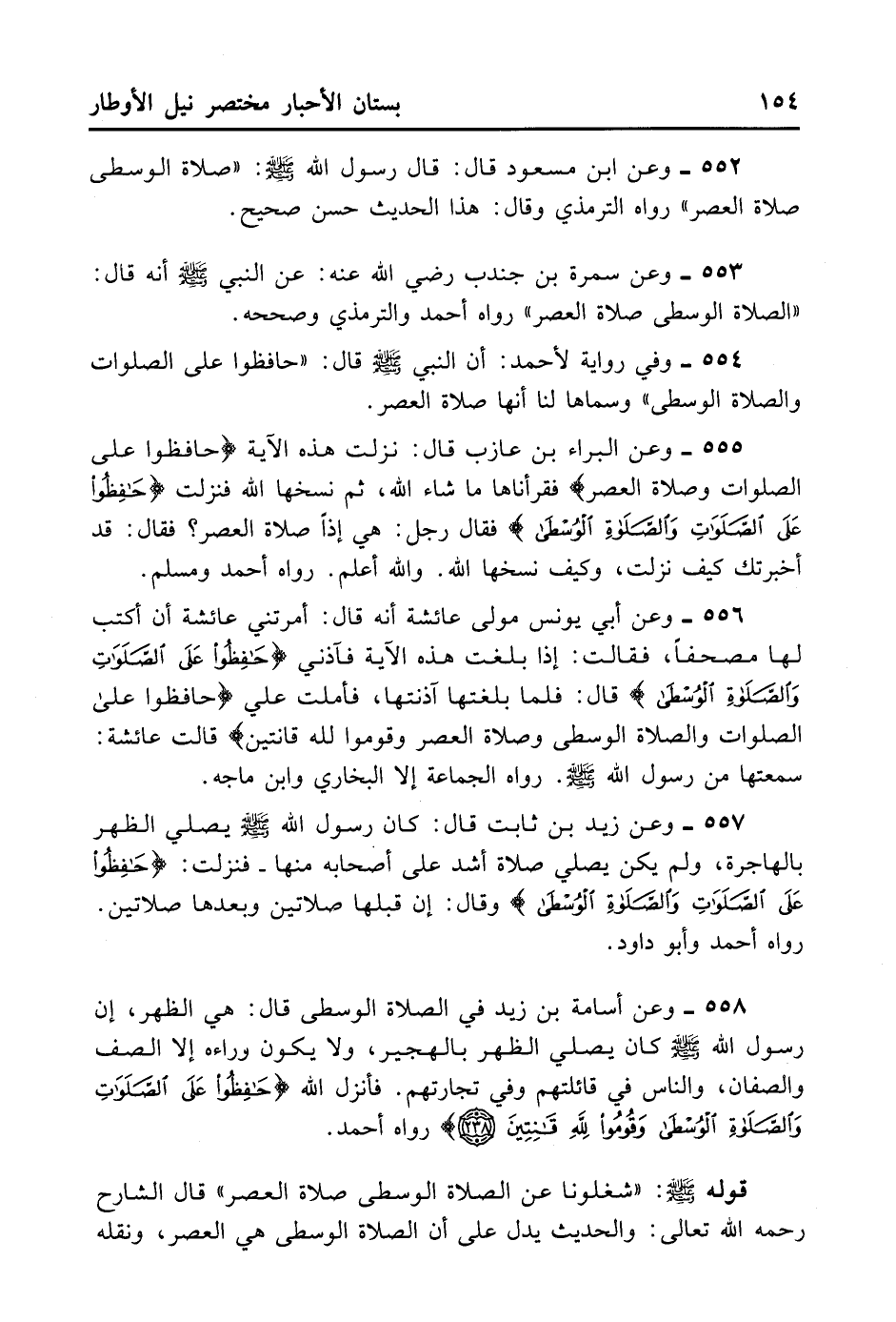 قوله - صلى الله عليه وسلم -: «شَغَلُونَا عَنْ الصَّلَاةِ الْوُسْطَى صَلَاةِ الْعَصْرِ» قَالَ الشَّارِحُ رَحِمَهُ اللَّهُ تَعَالَى: وَالْحَدِيثُ يَدُلُّ عَلَى أَنَّ صَلَاةَ الْوُسْطَى هِيَ الْعَصْرُ. وَنَقَلَهُ