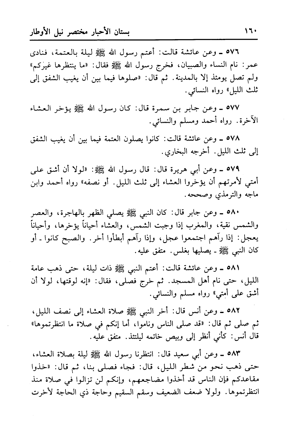 581- وَعَنْ عَائِشَةَ قَالَتْ: أَعْتَمَ النَّبِيُّ - صلى الله عليه وسلم - ذَات لَيْلَةٍ حَتَّى ذَهَبَ عَامَّةُ اللَّيْلِ حَتَّى نَامَ أَهْلُ الْمَسْجِدِ، ثُمَّ خَرَجَ فَصَلَّى، فَقَالَ: «إنَّهُ لَوَقْتُهَا، لَوْلَا أَنْ أَشُقَّ عَلَى أُمَّتِي» . رَوَاهُ مُسْلِمٌ وَالنَّسَائِيُّ.