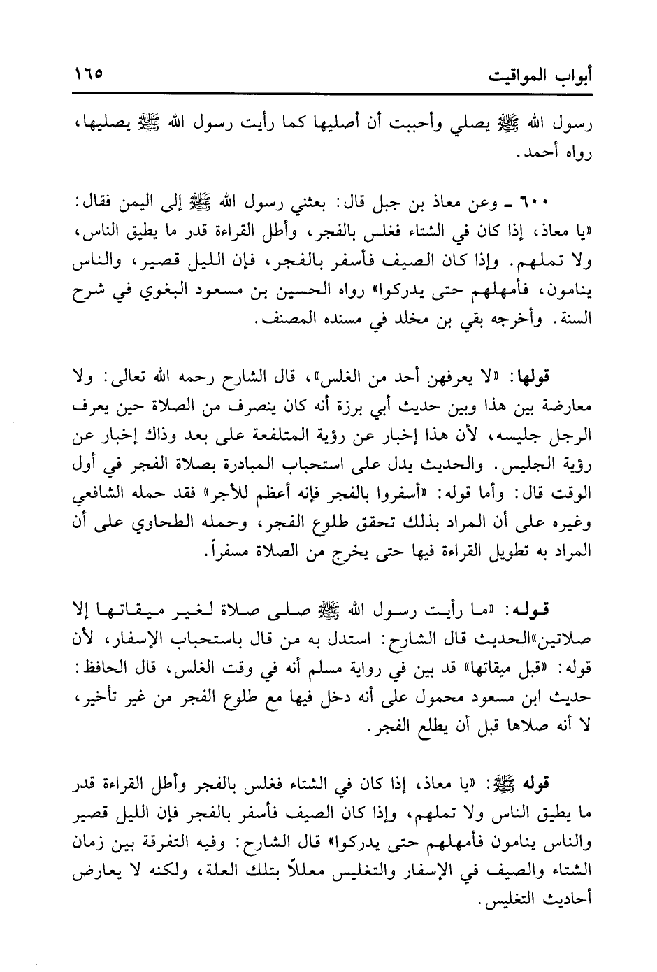 قَوْلُهُ: «يَا مُعَاذُ إذَا كَانَ فِي الشِّتَاءِ فَغَلِّسْ بِالْفَجْرِ وَأَطِلْ الْقِرَاءَةَ قَدْرَ مَا يُطِيقُ النَّاسُ وَلَا تَمَلَّهُمْ، وَإِذَا كَانَ الصَّيْفُ فَأَسْفِرْ بِالْفَجْرِ فَإِنَّ اللَّيْلَ قَصِيرٌ وَالنَّاسُ يَنَامُونَ فَأَمْهِلْهُمْ حَتَّى يُدْرِكُوا» . قَالَ الشَّارِحُ: وَفِيهِ التَّفْرِقَةُ بَيْنَ زَمَانِ الشِّتَاءِ وَالصَّيْفِ فِي الْإِسْفَارِ وَالتَّغْلِيسِ مُعَلَّلَا بِتِلْكَ الْعِلَّةِ، وَلَكِنَّهُ لَا يُعَارِضُ أَحَادِيثَ التَّغْلِيسِ.