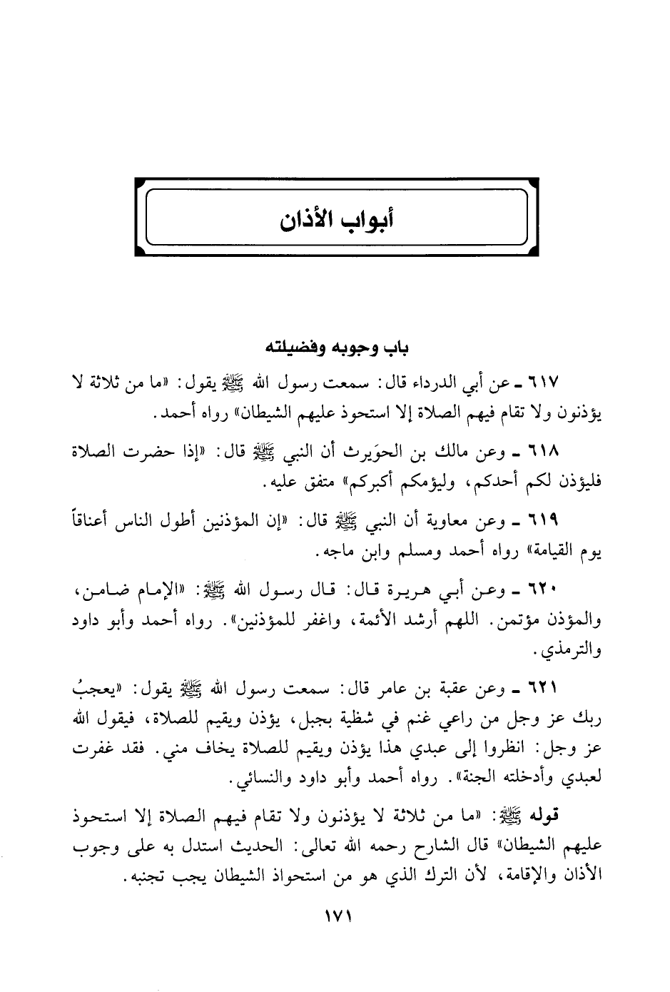 617- عَنْ أَبِي الدَّرْدَاءِ قَالَ: سَمِعْت رَسُولَ اللَّهِ - صلى الله عليه وسلم - يَقُولُ: «مَا مِنْ ثَلَاثَةٍ لَا يُؤَذِّنُونَ وَلَا تُقَامُ فِيهِمْ الصَّلَاةُ إلَّا اسْتَحْوَذَ عَلَيْهِمْ الشَّيْطَانُ» . رَوَاهُ أَحْمَدُ.