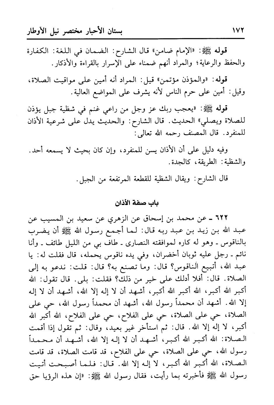 622- عَنْ مُحَمَّدِ بْنِ إِسْحَاقَ عَنْ الزُّهْرِيِّ عَنْ سَعِيدِ بْنِ الْمُسَيِّبِ عَنْ عَبْدِ اللَّهِ بْنِ زَيْدِ بْنِ عَبْدِ رَبِّهِ قَالَ: لَمَّا أَجْمَعَ رَسُولُ اللَّهِ - صلى الله عليه وسلم - أَنْ يَضْرِبَ بِالنَّاقُوسِ - وَهُوَ لَهُ كَارِهٌ لِمُوَافَقَتِهِ النَّصَارَى - طَافَ بِي مِنْ اللَّيْلِ طَائِفٌ - وَأَنَا نَائِمٌ - رَجُلٌ عَلَيْهِ ثَوْبَانِ أَخْضَرَانِ، وَفِي يَدِهِ نَاقُوسٌ يَحْمِلُهُ قَالَ: فَقُلْت: يَا عَبْدَ اللَّهِ أَتَبِيعُ النَّاقُوسَ، قَالَ: وَمَا تَصْنَعُ بِهِ؟ قَالَ: قُلْت: نَدْعُو بِهِ إلَى الصَّلَاةِ، قَالَ: أَفَلَا أَدُلُّك عَلَى خَيْرٍ مِنْ ذَلِكَ؟ فَقُلْت: بَلَى، قَالَ: تَقُولُ: اللَّهُ أَكْبَرُ اللَّهُ أَكْبَرُ، اللَّهُ أَكْبَرُ اللَّهُ أَكْبَرُ، أَشْهَدُ أَنْ لَا إلَهَ إلَّا اللَّهُ، أَشْهَدُ أَنْ لَا إلَهَ إلَّا اللَّهُ أَشْهَدُ أَنَّ مُحَمَّدًا رَسُولُ اللَّهِ، أَشْهَدُ أَنَّ مُحَمَّدًا رَسُولُ اللَّهِ حَيَّ عَلَى الصَّلَاةِ، حَيَّ عَلَى الصَّلَاةِ، حَيَّ عَلَى الْفَلَاحِ، حَيَّ عَلَى الْفَلَاحِ، اللَّهُ أَكْبَرُ اللَّهُ أَكْبَرُ لَا إلَهَ إلَّا اللَّهُ. قَالَ: ثُمَّ اسْتَأْخَرَ غَيْرَ بَعِيدٍ قَالَ: ثُمَّ تَقُولُ إذَا أَقَمْت الصَّلَاةَ: اللَّهُ أَكْبَرُ اللَّهُ أَكْبَرُ أَشْهَدُ أَنْ لَا إلَهَ إلَّا اللَّهُ أَشْهَدُ أَنَّ مُحَمَّدًا رَسُولُ اللَّهِ حَيَّ عَلَى الصَّلَاةِ حَيَّ عَلَى